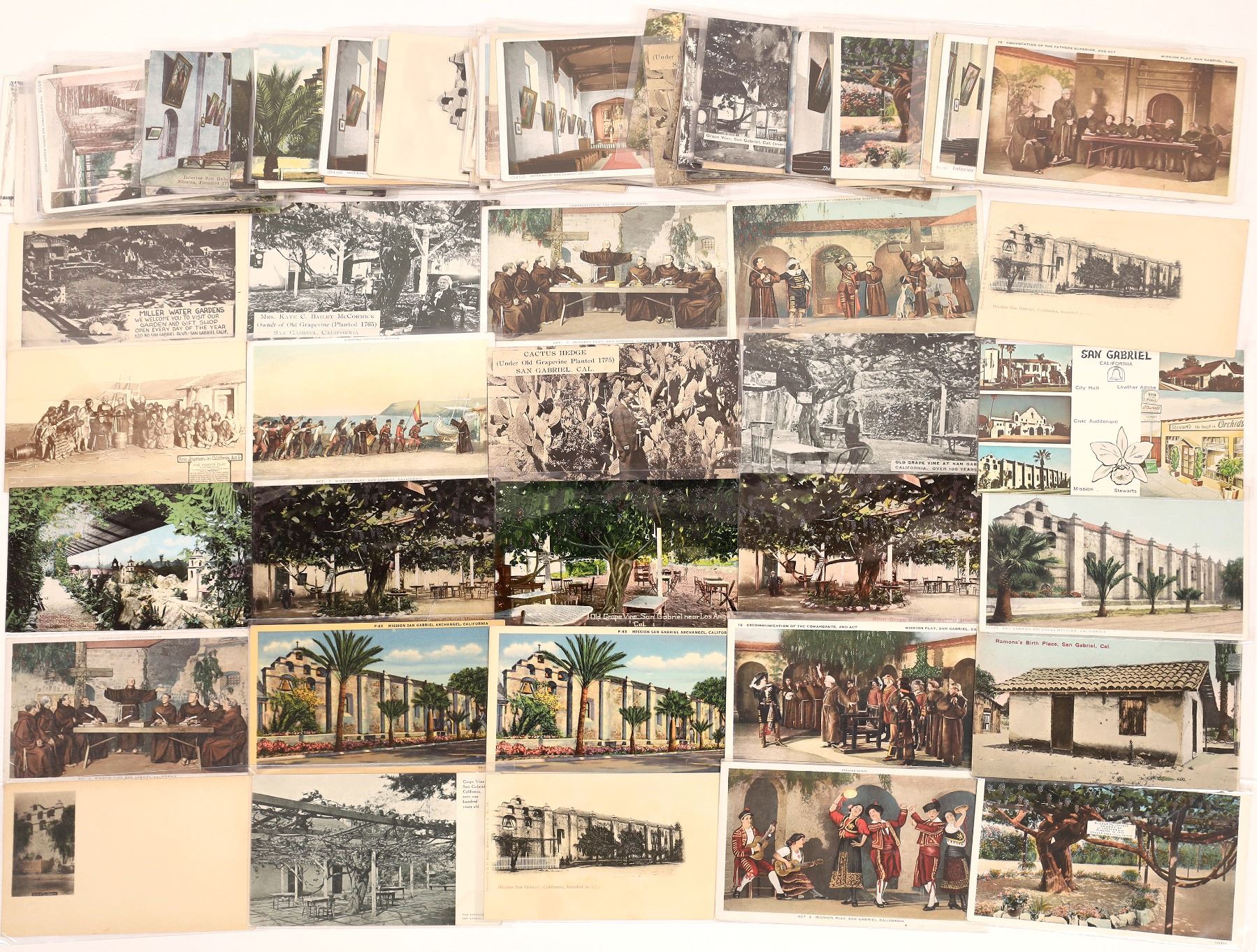 Lot of 100. Twenty One have writing/postmarked: San Gabriel, L.A., Pasadena, S.F., Modesto, Hollywood. One cent stamps cancelled. Ground view: every part of the Mission exterior and interior, garden, ground and playhouse is depicted. One PC of Mrs. Kate C Bailey McCormick owner of the Old Grape Vine planted 1865. PC of Miller Water Gardens (white border), Cactus Hedge, Mission Bell, West View El Camino Real Playhouse Garde. And lots more. Protective sleeves. State:California City:San Gabriel Date:1907-48 Provenance: Ken Prag Collection