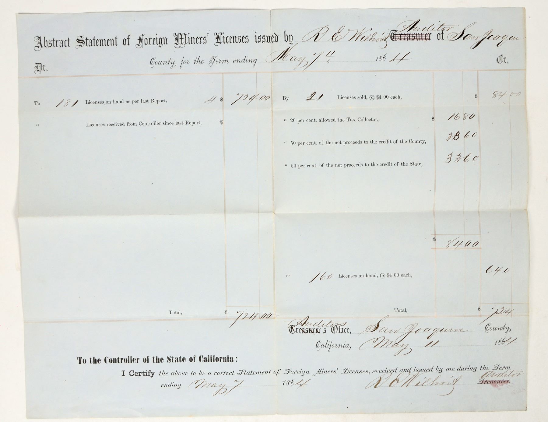 This is a very rare document from the San Joaquin County, Cal. Auditor on revenue received/distributed from foreign miner's license revenue. It is dated May 7, 1864. Signed by R.E. Williams auditor. The document is 13 in. X 16 in. folded into quarters at the center. Very readable document. Please see photos for details.