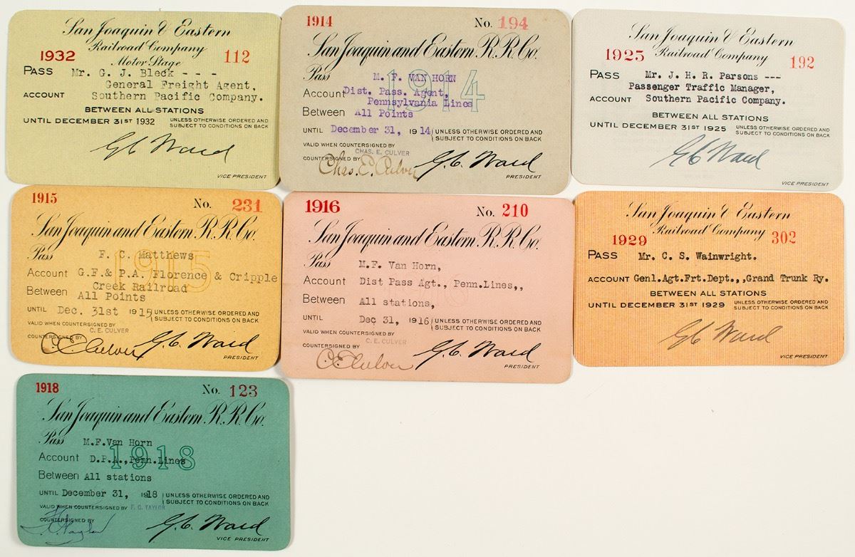Lot of 7 different passes. Years included: 1914, 1915, 1916, 1918, 1925, 1929, and 1932. Some toning/soiling. Operated in the Sierra Nevada foothills of Fresno County from 1912-1933, El Prado to Big Creek. Primarily built to service the Big Creek Hydroelectric Project. (Prag Collection) City: Fresno County State: California, Date: Inventory# 41043