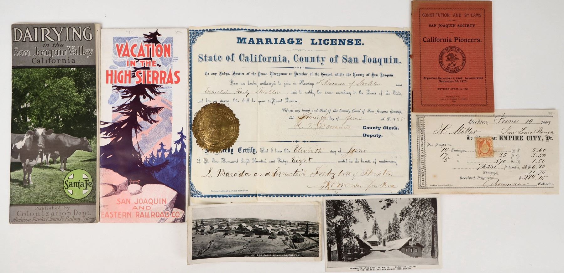 Lot of (6). Eclectic lot, contains a 1869 Empire City receipt and stamp, a 1868 San Joaquin Marriage License, and 1c Photo Post Card of the Huntington Lake Lodge Cabin buried in the snow at 7000 feet. There is a foldout "Dairying in the San Joaquin Valley map from the Santa Fe Railroad, another foldout "Vacation in the High Sierras" map from the San Joaquin and eastern Railroad, and finally the San Joaquin Society California Pioneers Constitution and By-Laws Booklet from 1893. All these items are in very good to excellent condition, please inspect.
