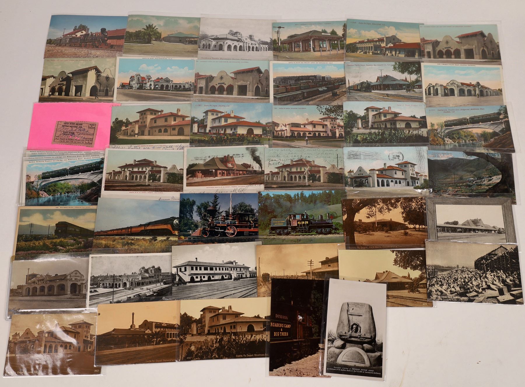 Rail road stations and railway scenes in the San Joaquin and Central Valleys of California. Stations in the lot include Bakersfield, Bay Point, Capitola, Fresno, Jamestown, Lodi, Oakdale, Porterville, San Bernardino, and Stockton. and for good measure, the lot includes a passage ticket on the Hetch Hetchy Railroad dated 1924.
