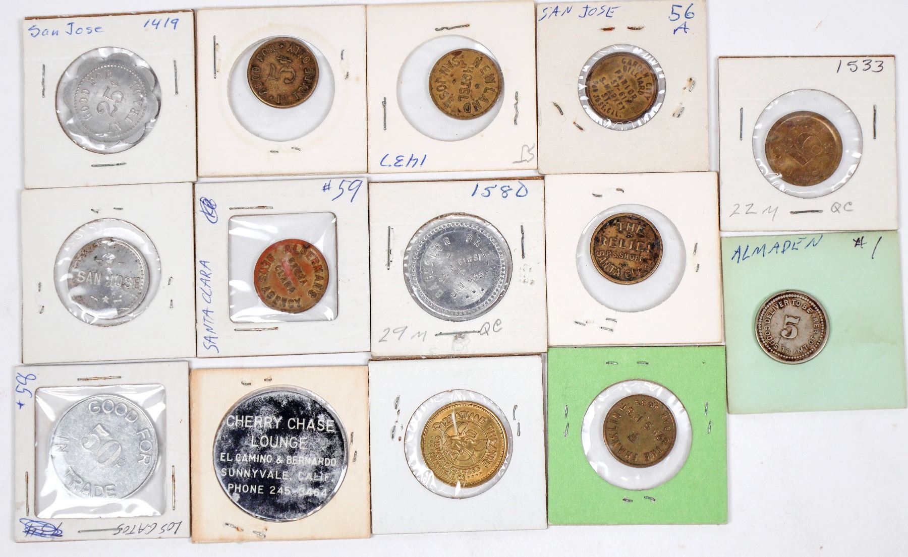 Lot of fourteen tokens from the southern Bay Area: 1) New Almaden: Almaden/5/Store//Deliver to Bearer/5c/Goods To Amt. WM, rd., 21 mm. (The New Almaden Quicksilver mine is the oldest and most productive quicksilver mine in the United States.) 2) BLACK WATCH / LOS GATOS CALIF. // GOOD FOR / 50¢ / IN TRADE; Al., rd., 32 mm. 3) CHERRY CHASE / LOUNGE / EL CAMINO & BERNARDO / SUNNYVALE, CALIF. / PHONE 245-3464 // GOOD FOR / ONE / DRINK; Black plastic, rd., 38 mm. 4) PIZZATIME THEATRE / (Chuck) © / CHUCK E. CHEESE / SUNNYVALE, CA. // IN PIZZA WE TRUST / 25c / PLAY / VALUE / 1980; Br., rd., 25 mm.