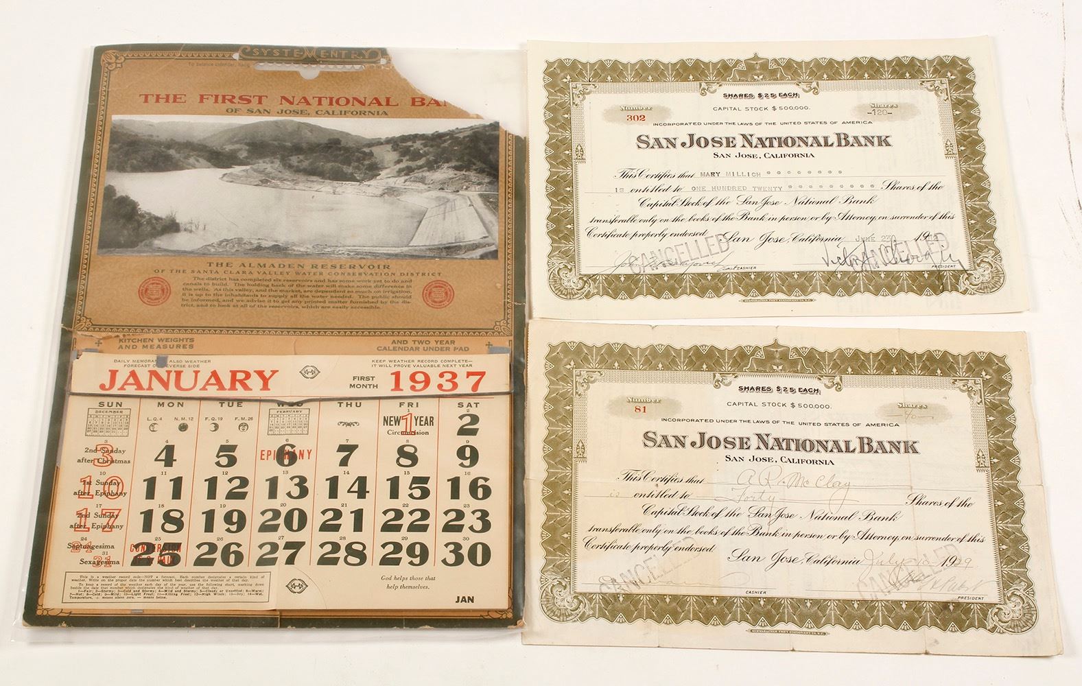 2 San Jose Bank certificates i/c 1929 and 1942, one has several fold edge tears. 1937 calendar from First National Bank of San Jose, upper right corner is torn off, tear on left middle, approx 2". HWAC# 57952 Date: Location: San Jose, California