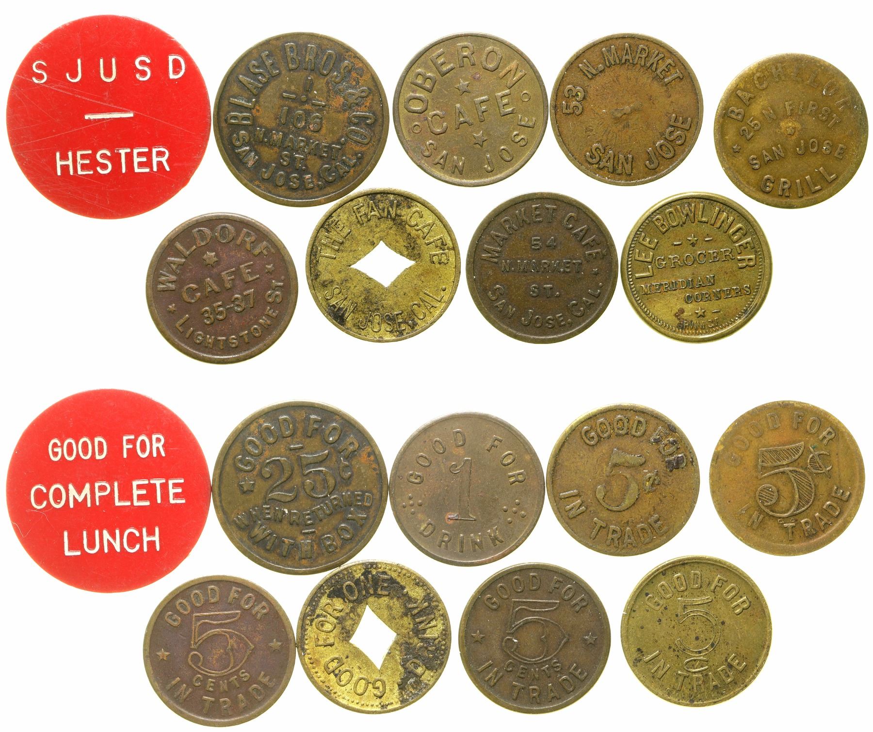 Lot of nine: Market Cafe, Europe Cafe, Waldorf Cafe, Oberon Cafe, The Fan Cafe, Hester School Lunch Token, Bachelor Club Grill, Lee Bowlinger Grocer, Blase Brothers.