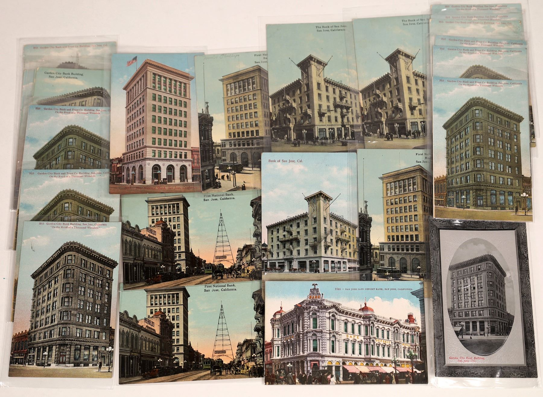 Four banks from San Jose, California, represented in this set of two dozen postcards: San Jose Safe Deposit Bank (1), Bank of San Jose (3), First National Bank (5), Garden City Bank & Trust (14 color, 1 B&W)
