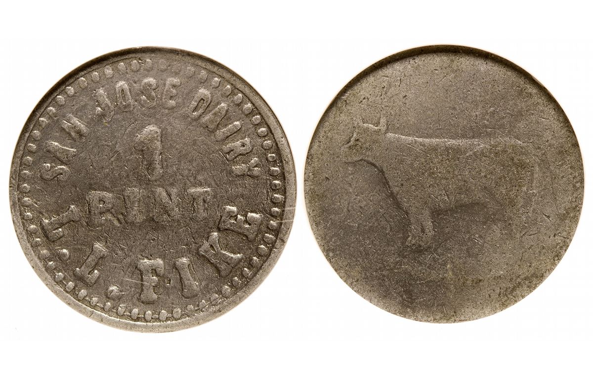 Obv.: San Jose Dairy / 1 / Pint / L.L. Fike; rev.: pictorial bull; R9, NGC F12.