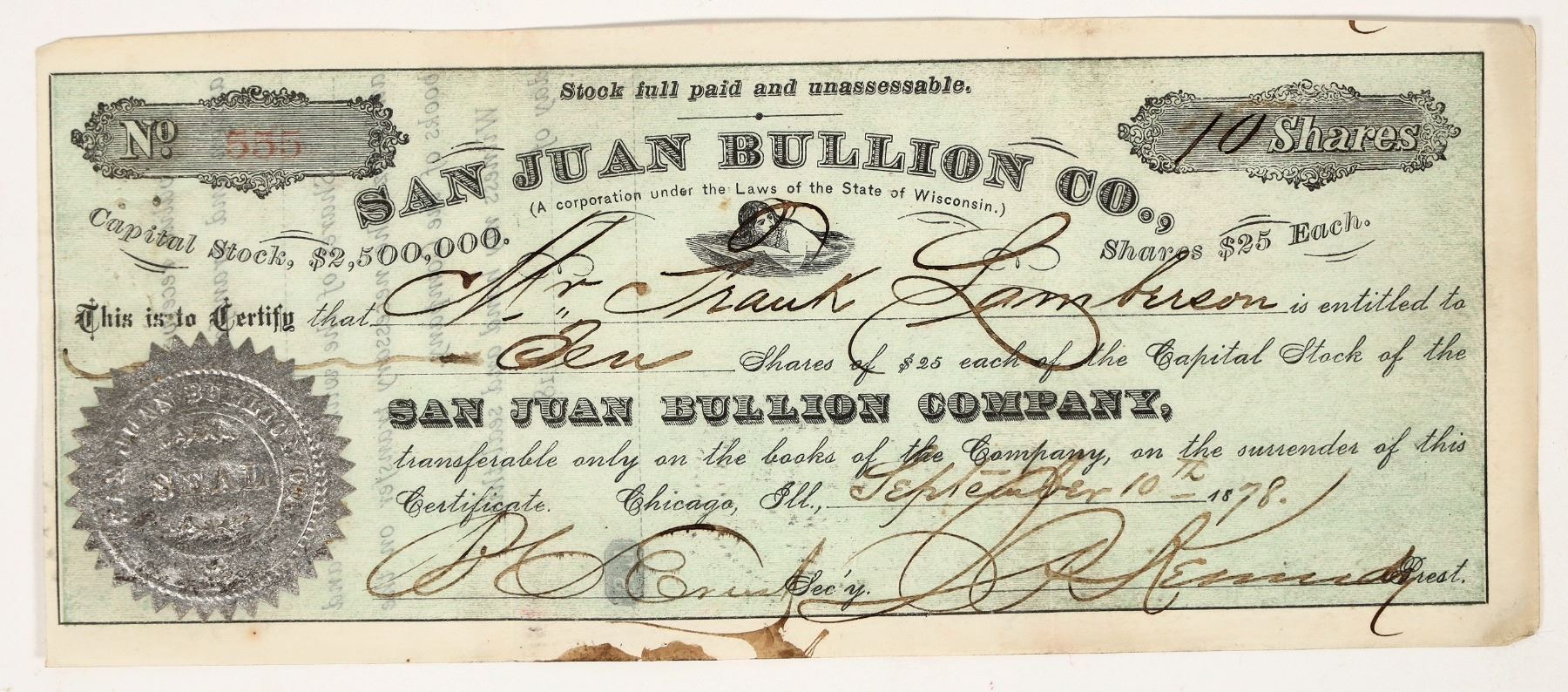 Rare. Great name for a mining company! Inc. in Wisconsin. No. 555, issued for 10 shares to Frank Lamberson in Chicago in 1878. Signed by president Kennedy and the secretary. Not cancelled. Black border, silver seal, green background, and small allegorical vignette. 3.25 x 7.75" Deep folds, stains. Not in C&L. In E&MJ (October 1878), it is reported that the company owns the Prince of Wales Mine (near the Mountain Queen), "ore runs over 150 ounces, and there are two and a half feet of it." In 1879, the company had a rich strike on the Loma Lode near Animas Forks. (The Colorado Miner (Weekly), March 29, 1879)