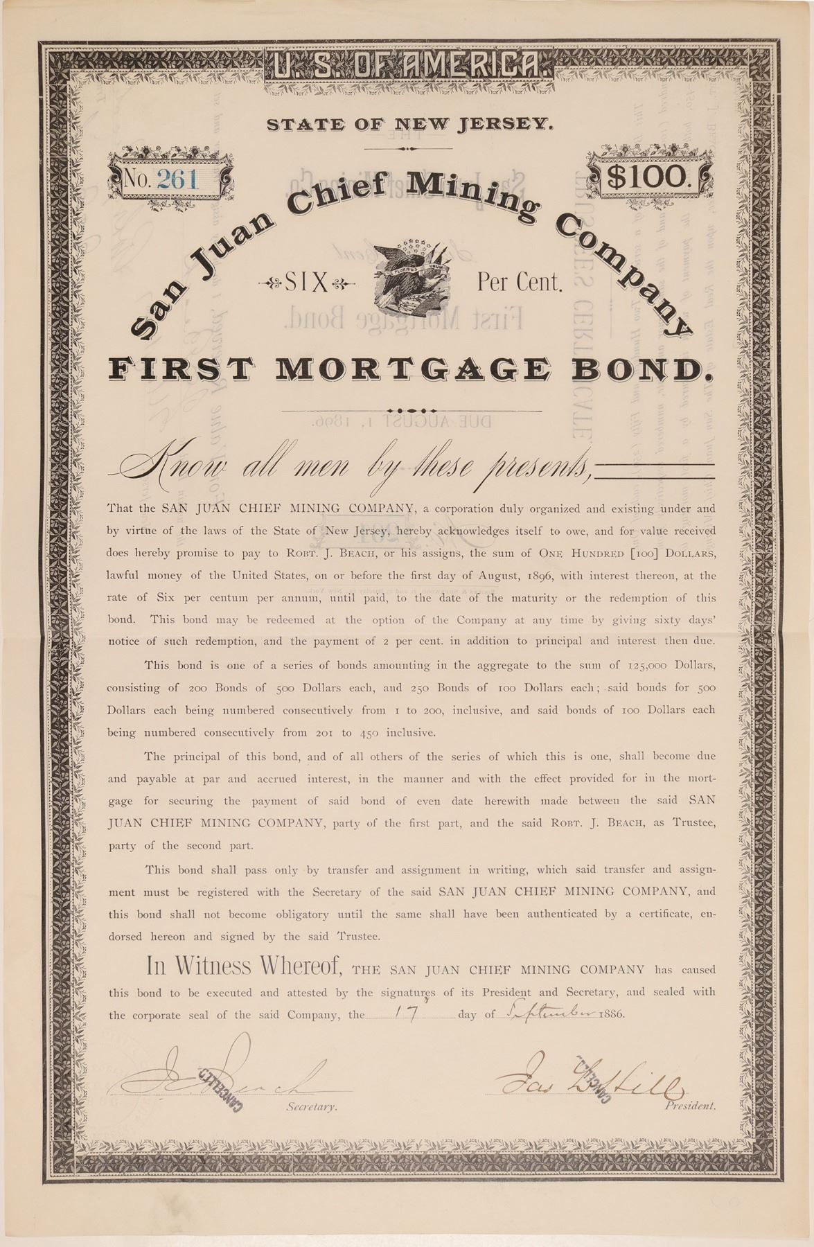 # 261 signed by presdient James Hill and Secretary J Beach. One viertical fold. Not issues. Extremely fine. Ken Prag Collection