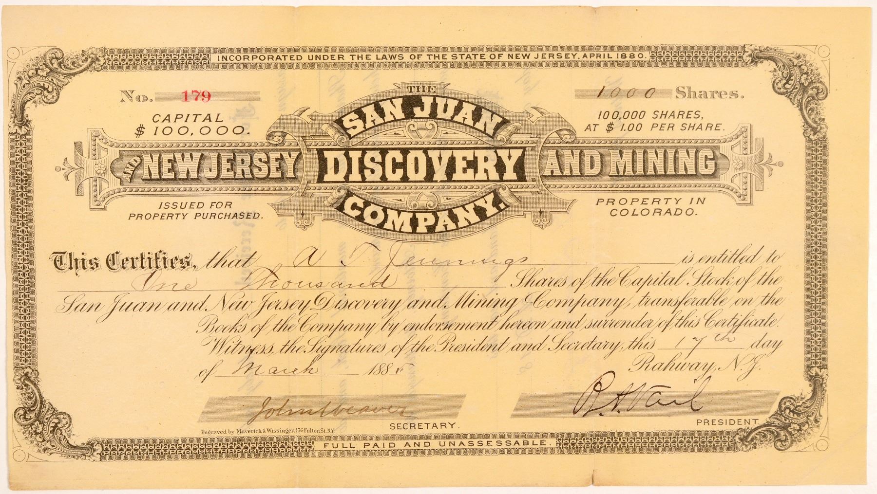 Inc. in New Jersey, April 1880. No. 179, issued for 1,000 shares to A.T. Jennings on March 17th, 1885. Signed by president B.A. Vail and secretary John Weaver. Black border and fancy logo, printed on yellow paper by Maverick & Wissinger, NY. Not cancelled. Deep folds with some separation and small areas of soiling. 5.5 x 10" Not listed in the 1883 CO Mining Directory. Described in Balch, 1882: numerous claims in the Uncompahgre District (Ouray/San Juan Counties) and claims in the Pioneer and Rico Districts (in adjacent Dolores County). Most work has been done on the Western Belle claim. "The object of the company is to secure all the good mine claims possible in the San Juan district..." [See: Balch, 1882, pg.1126] Ken Prag Collection