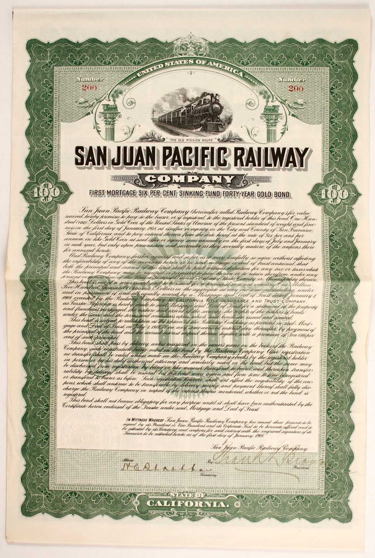 incorporated State of Calif. 1907. Bond #200 for $100 6% First Mortgage Sinking Fund Forty Year Gold Bearer Bond , issued January 1, 1908, due January 1, 1948 signed president illegible signature, co. seal left lower, green, "100" in green sunburst underprint, vignette train l-r with columns on either side with locomotives, "The Old Mission Route" beneath, coupons attached (all), Printer: The Union Litho Co S.F.. Very Fine condition. Cox ref i