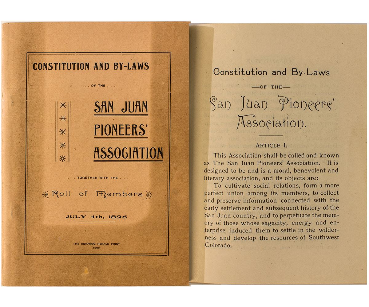 This small (5.75" x 4") is the constitution and by-laws for the association. It also includes a roll of members. Article I. states: "This association shall be called and known as the San Juan Pioneers; association. It is designed to be a moral, benevolent and literary association, and its objects are: to cultivate social relations, form a more perfect union among its members, to collect and preserve information connected with the early settlement and subsequent history of the San Juan country, and to perpetuate the memory of those whose sagacity, energy, and enterprise induced them to settle in the wilderness and develop the resources of Southwest Colorado."