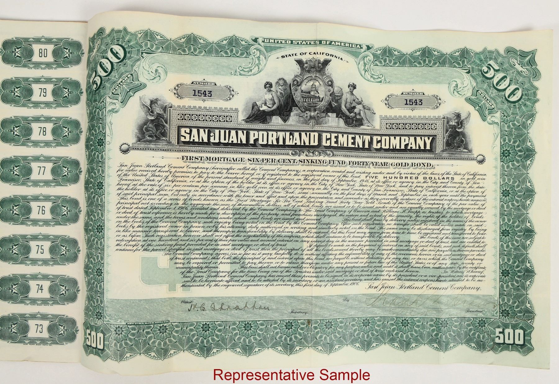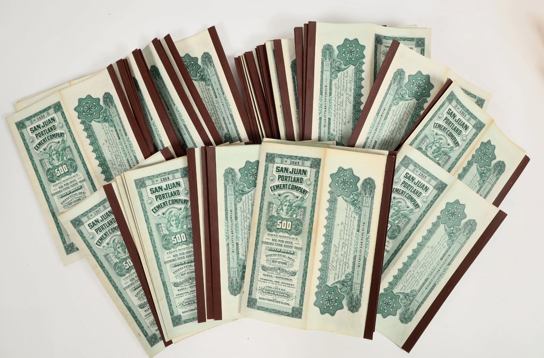 Approx.. 40.All I/U. Issued 1906. Fine or better. San Juan Portland Cement Co. New York BNC printer. Incorporated 1906 California.