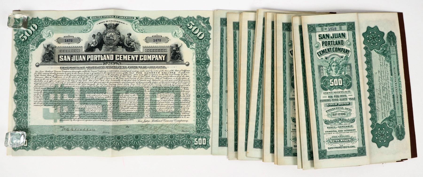 Lot of 18. I/U. Issued 1906. EF cond. San Juan Portland Cement Co., $500, 6% gold bearer bonds with coupons. New York BNC printer.