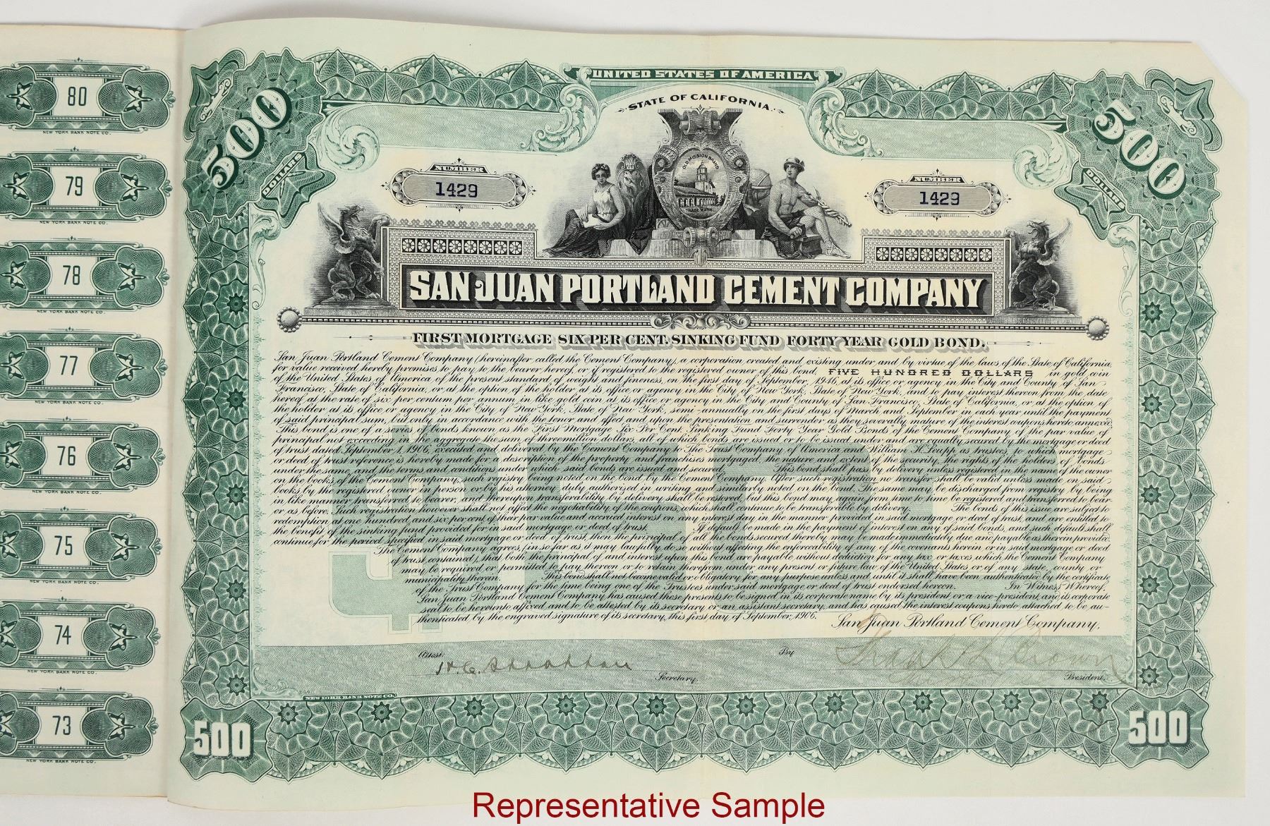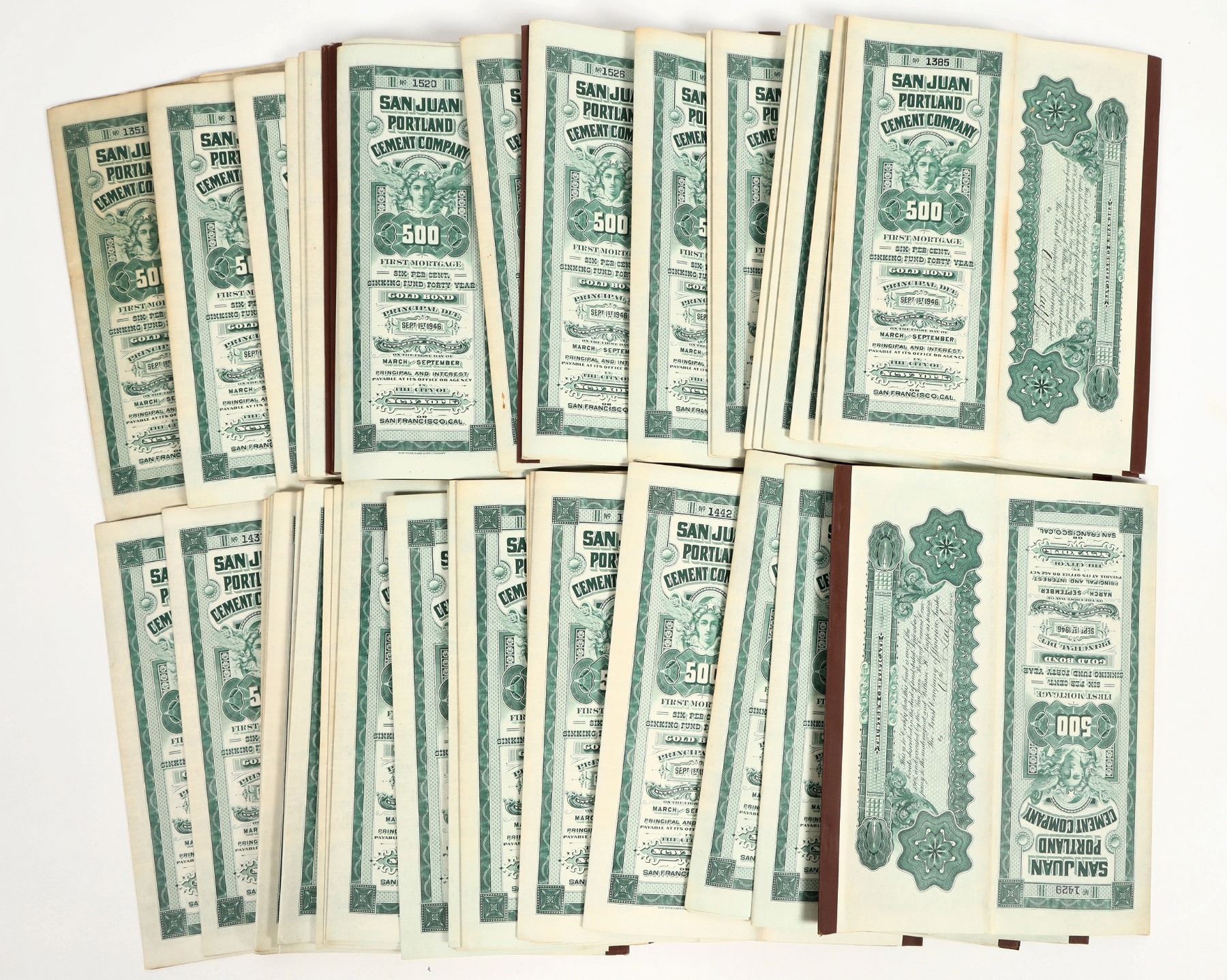 Approx.. 40.All I/U. Issued 1906. Fine or better. San Juan Portland Cement Co. New York BNC printer. Incorporated 1906 California.