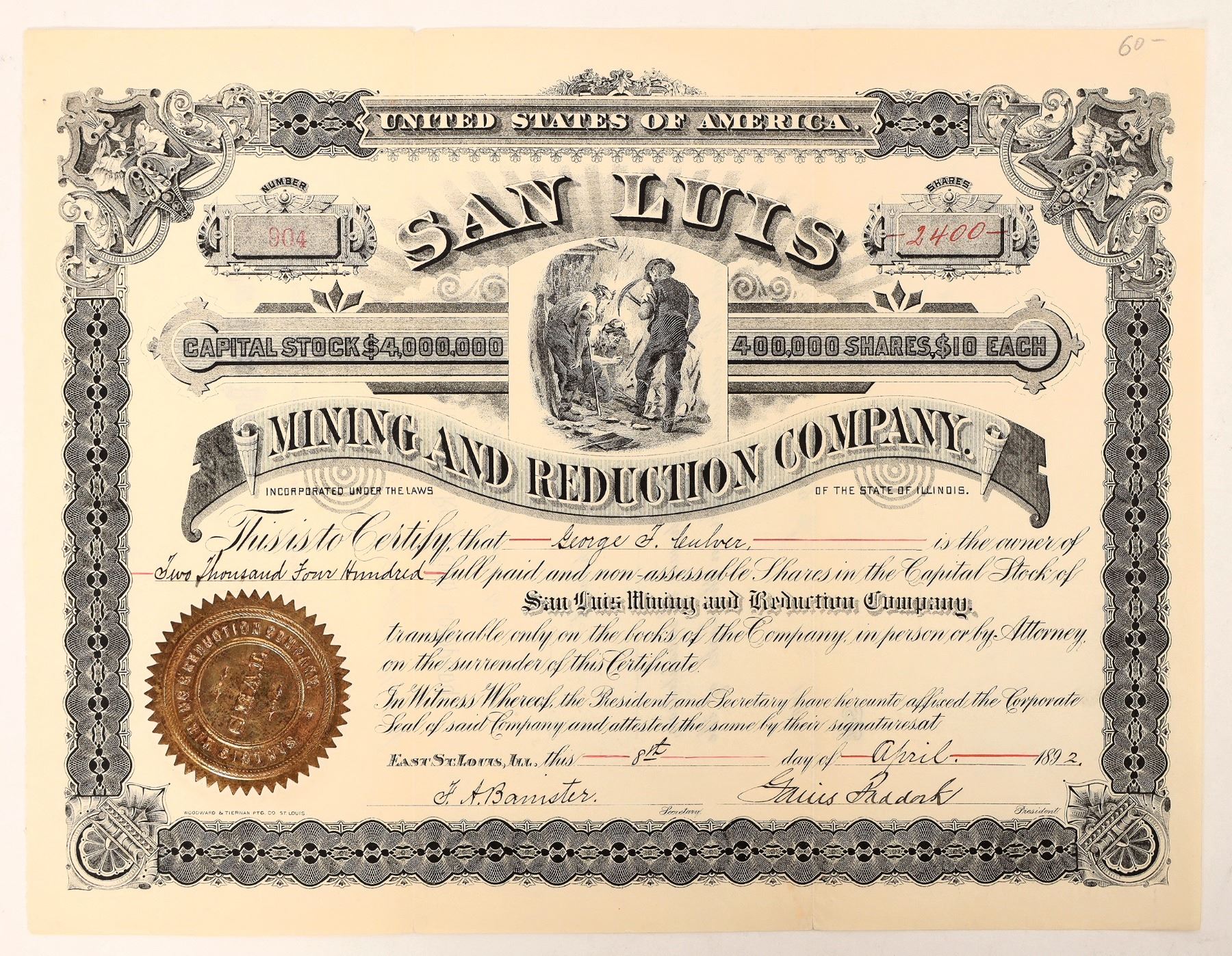 Issued 1892 San Luis Mining and Reduction stock. Mining vignette. Small upper and lower left crease tears.[ San Juan Confederate States of America