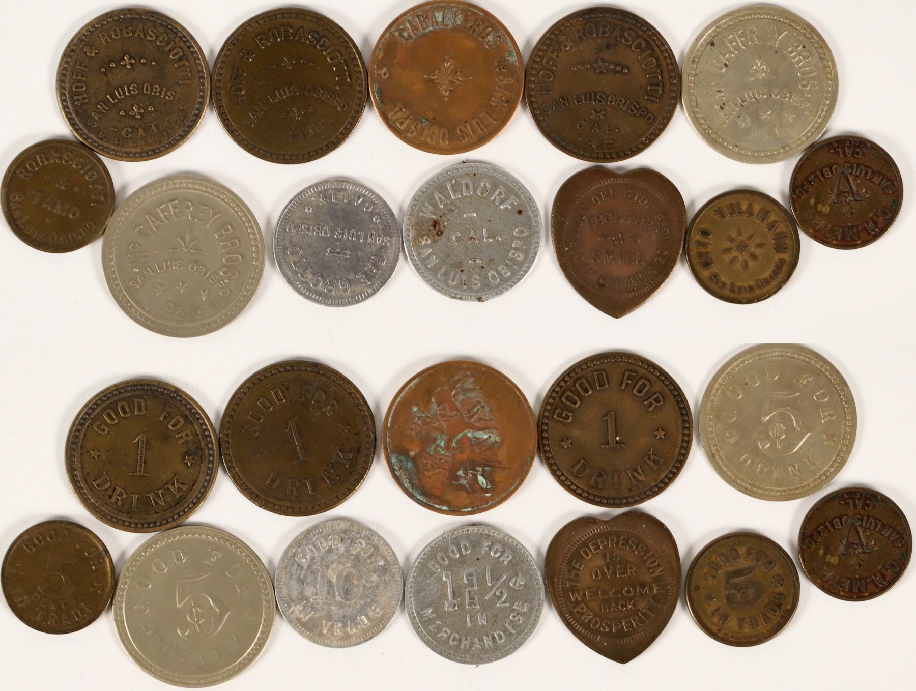 Group of 12 tokens includes: Caballeros de San Luis Obispo, O' Reilly One Stop Service, McCaffrey Bros. (2), Hoff & Robasciotti (3), Robasciotti & Tamo, Waldorf, Cal., The Grotto, Otto Tullmann, C.H. Meyer,