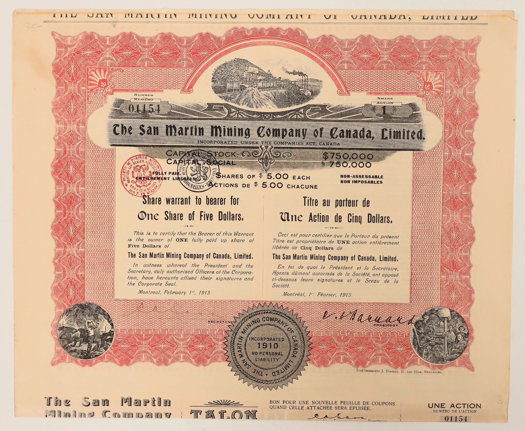 Issued 1913 San Martin Mining Co. of Canada stock. We could not find any info on this company.[ Montreal Canada