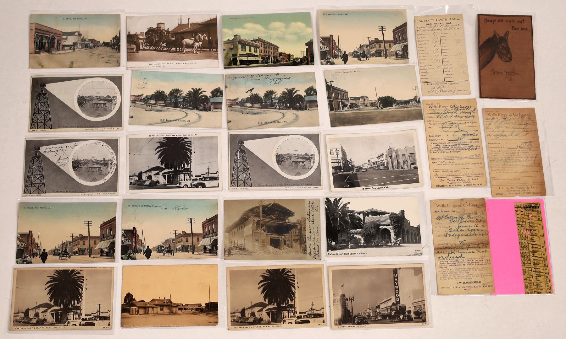 Twenty-six RPCs and litho postcards, and ephemera, from San Mateo, Calif., c1906-1949. A dozen postcards are canceled, with stamps, including one from San Mateo, 1906, depicting ruins from the earthquake along with handwritten comments about it. Postcards feature street scenes, railroad depots and a leather postcard with two 1906 cancels from S.F. and San Mateo. Group includes Southern Pacific RR ticket and four pieces of ephemera.