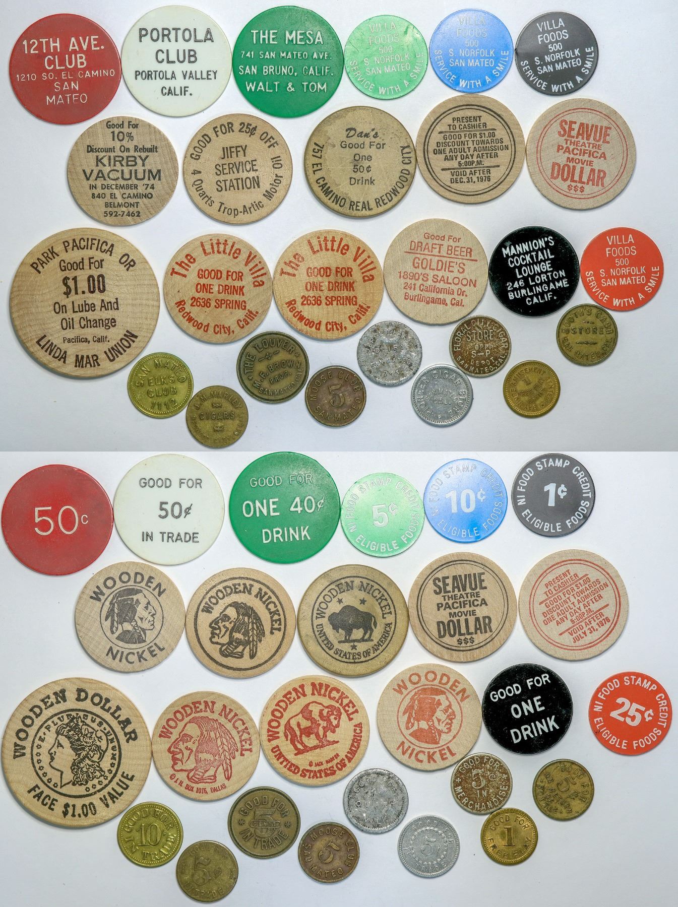 22 pieces. San Mateo, Pacifica, Portola Valley, Belmont, Redwood City, San Bruno, Bayshore, Burlingame, and Daly City. Examples: The Mesa San Bruno GF 40c, Booth's Cash Store San Mateo GF 5c refund on bottle, Jersey Farm Dairy San Mateo GF 1 qt milk, 2 Seavue Theatre Pacifica GF $1 admission (wood), Mannion's Cocktail lounge Burlingame GF one drink, J. M. Marley Cigars Redwood City GF 5c, Portola Club Portola Valley GF50c (plastic).