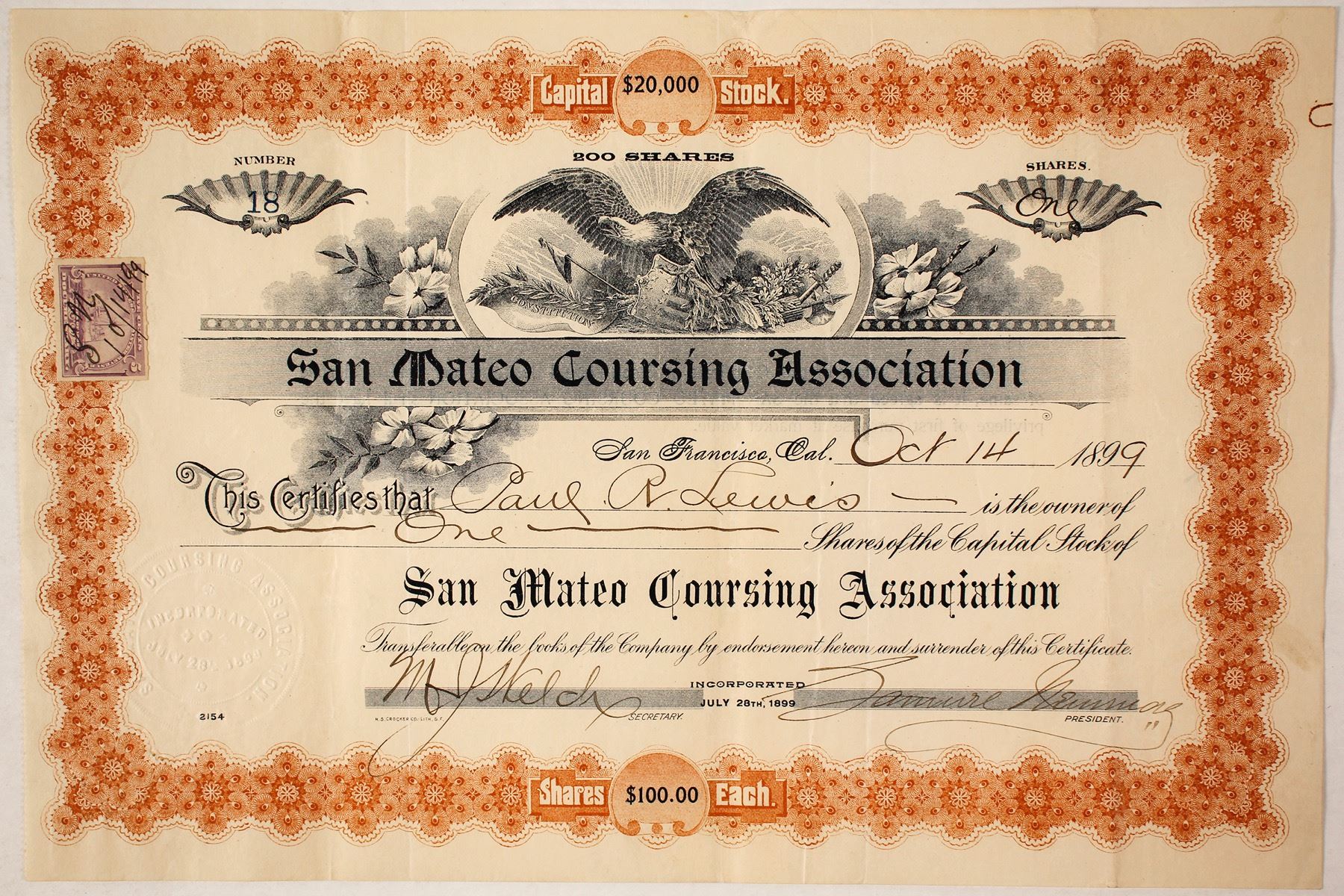 Coursing is the pursuit of game or other animals by dogs—chiefly greyhounds and other sighthounds—catching their prey by speed, running by sight, but not by scent. Coursing was a common hunting technique, practised by the nobility, the landed and wealthy, and commoners with sighthounds and lurchers. No. 18, issued for one share to Paul R. Lewis on Oct. 14th, 1899 in San Francisco. Signed by president Samuel Newman and secretary M.J. Welch. Not cancelled. Eagle vignette and floral border. Folds, some toning and a paper clip stain.