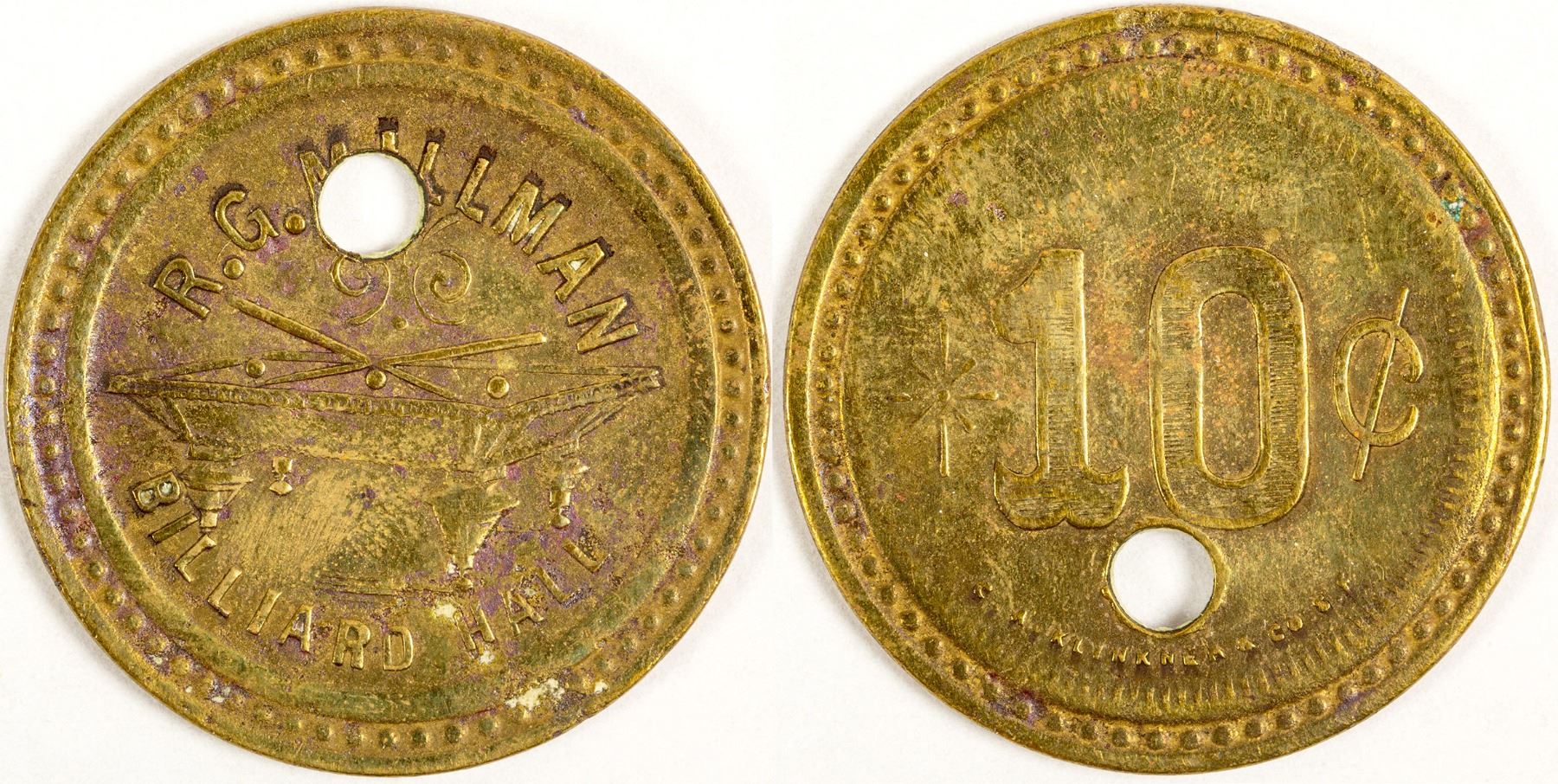 Obv.: R.G. Millman / pictorial / Billiard Hall; Rev.: 10c. Br., rd., holed, 28 mm. Daniel Manassillian Collection. Attributed to San Miguel, CA on tokencatalog.com based on census data.