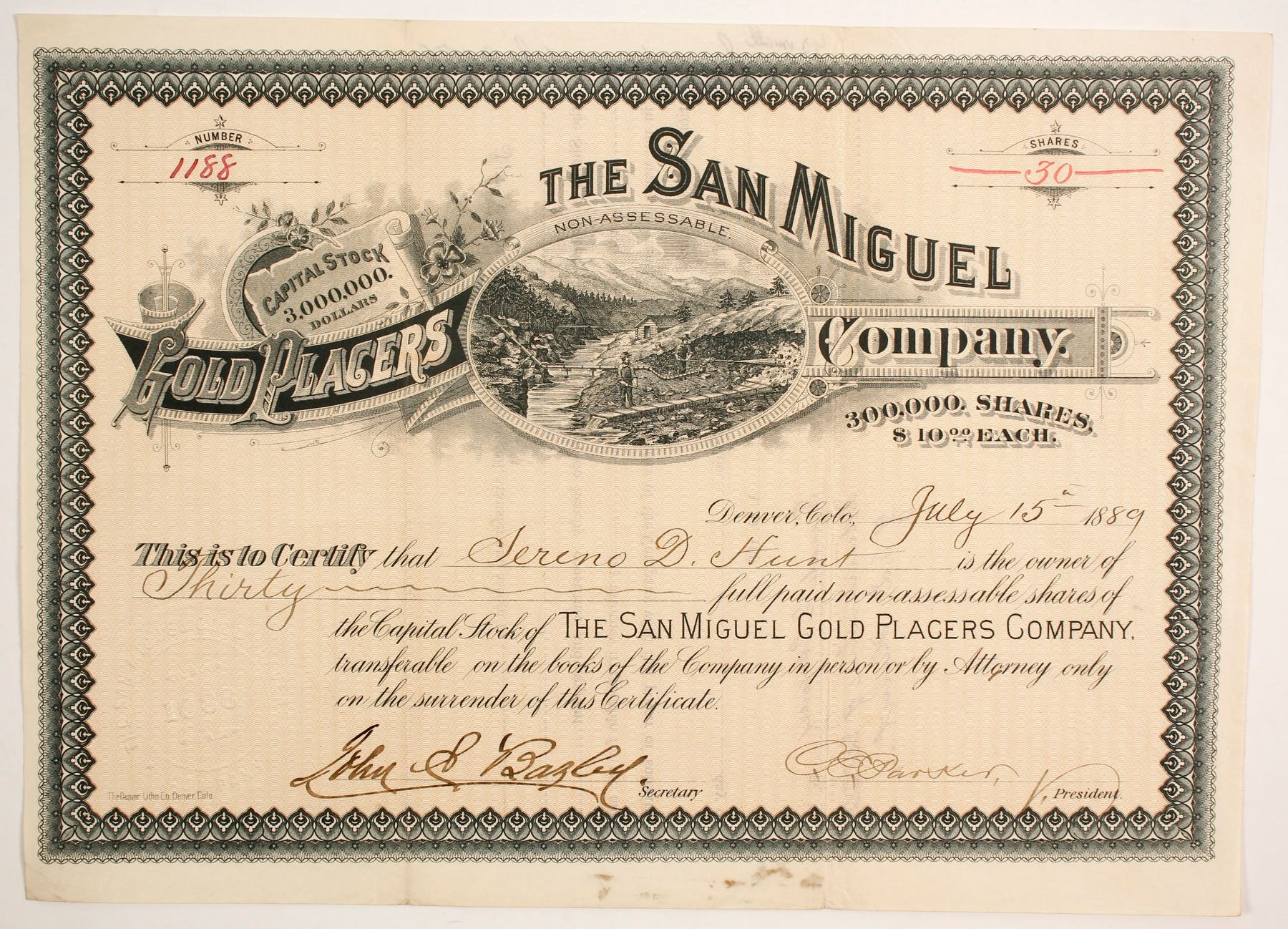 # 1188 for 30 shares to Sereno D Hunt. Signed by John Bagley and vice president parker. Dateline Denver 1889. Incorporated 1888. Not issued. Great vignette of pipe coming down the hillside to a water hose being used by miners to blast away a hillside. Denver Litho Co. printer. Border staining. One dog ear. Nice. Located at San Miguel River 5 miles west of Telluride. The company was reported to be operating two hydraulic giants (monitors) using over 6 million cubic feet of water with a 200 foot fall on "E' Bar. One of eleven owned by this company, washing 5,000 cubic yards of gravel daily. [Ref: Burchard 1884, EMJ Vol. 47 No. 20, Dallas 1985] Ken Prag Collection
