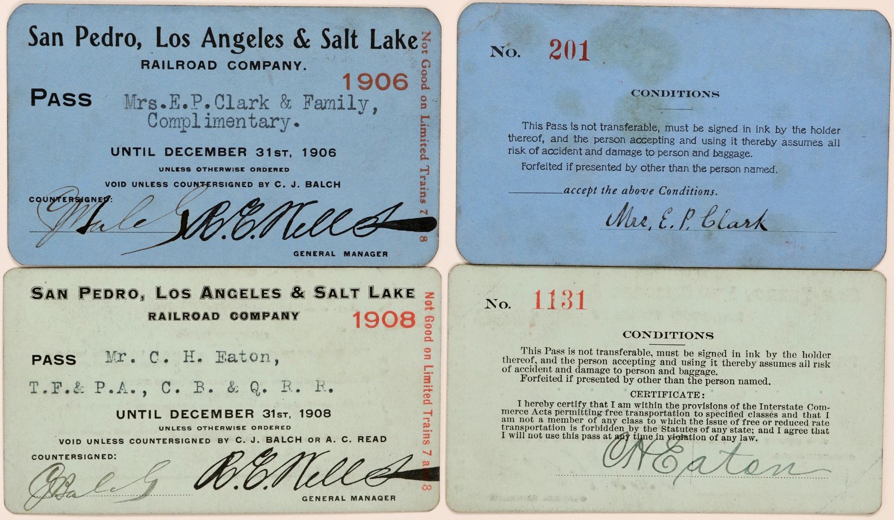 Lot of 2 different. 1) 1906. Issued to EP Clark and family. Printed sig. of the general manager. Countersigned by CJ Balch. Black print on blue cardstock. Some staining. 2) 1908. Issued to CH Eaton, CB&Q Railroad. Printed sig. of the general manager. Countersigned by CJ Balch. Black print on light blue cardstock. This railroad, incorporated in 1901 was the first attempt at a direct route from Los Angeles to Salt Lake City. It is largely responsible for the development of Las Vegas, which was built along the tracks. Behind the rail were the Clark brothers (William and J. Ross) who had made their fortune in Montana mining operations. W.A. Clark was looking for a way to send his Utah copper ore to the ports of Southern California. Clark bought the Stewart Ranch and Las Vegas Springs, situated in the future site of Las Vegas. Trains reached Vegas by 1905, and Clark auctioned off many plots of land that were the building blocks for the future city. The two brothers also used Vegas as a main depot to launch a rail line to their mining interests in Nevada (the Las Vegas & Tonopah).
