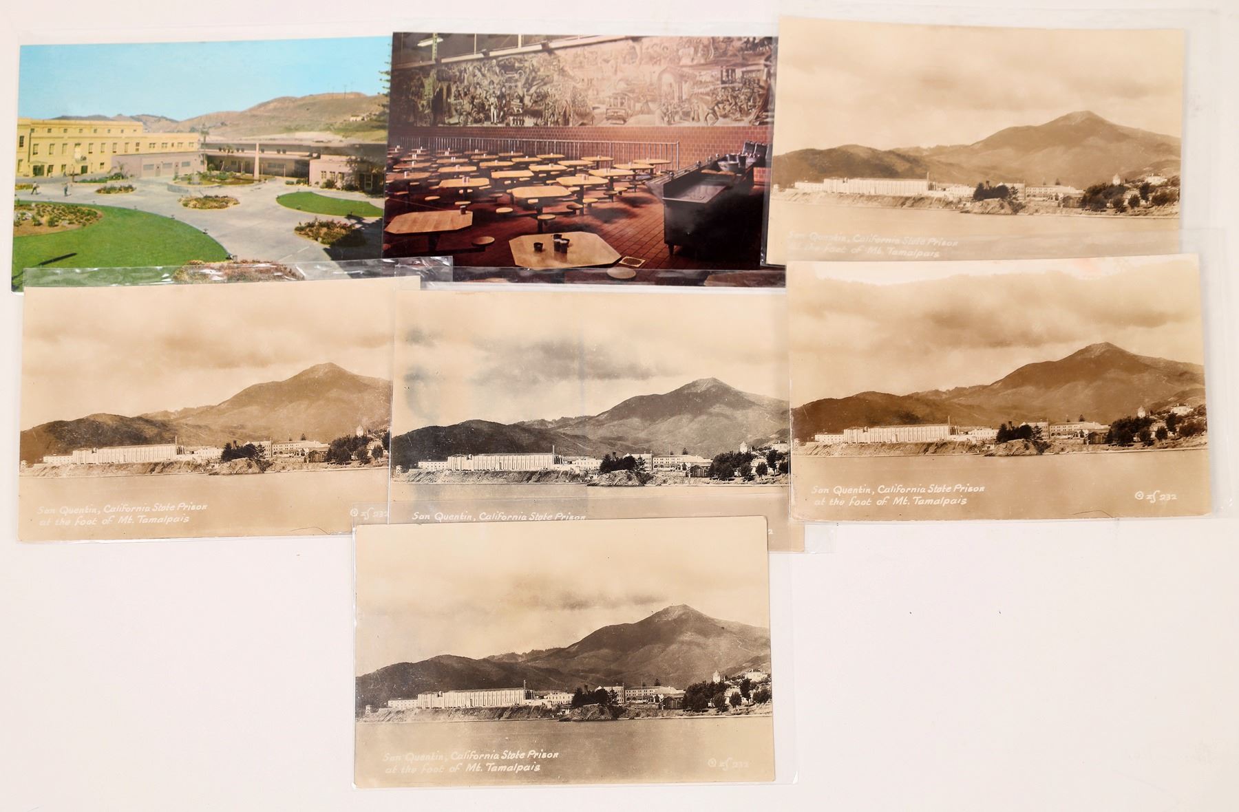 Lot of 7. None postmarked . 1. Five identical views of San Quentin from a distance w/ Mt. Tamalpais in the background. Borderless. Small pencil price writing, no personal notes. 2. Color, borderless , inmate south dining room. 3. Color, borderless, Catholic and Protestant chapel garden.. All in exc. condition.