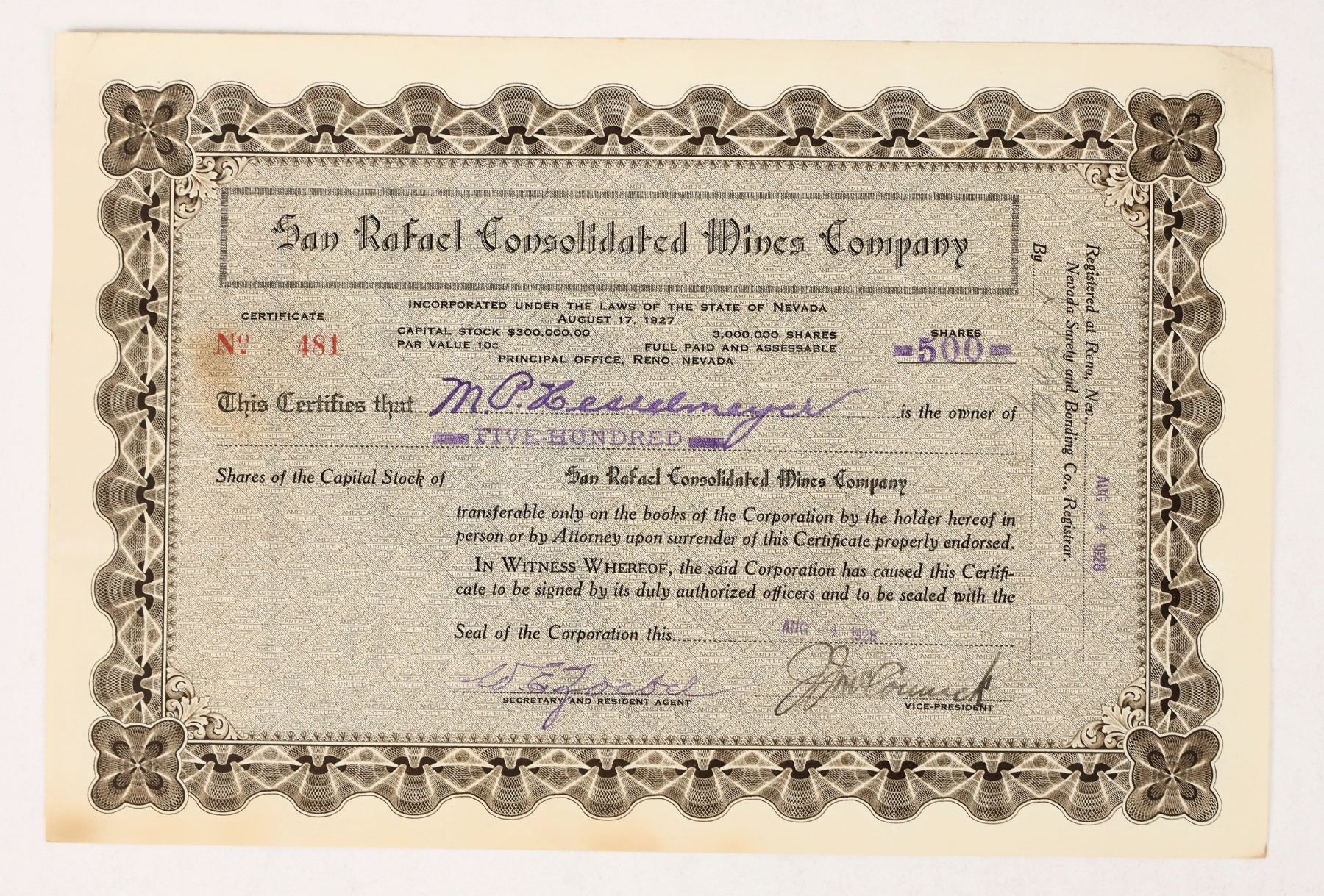San Rafael Consolidated Mines Company Stock, 1928. Quartz Mountain, Nye County. Principal office in Reno, issued to M. P. Hesselmeyer.