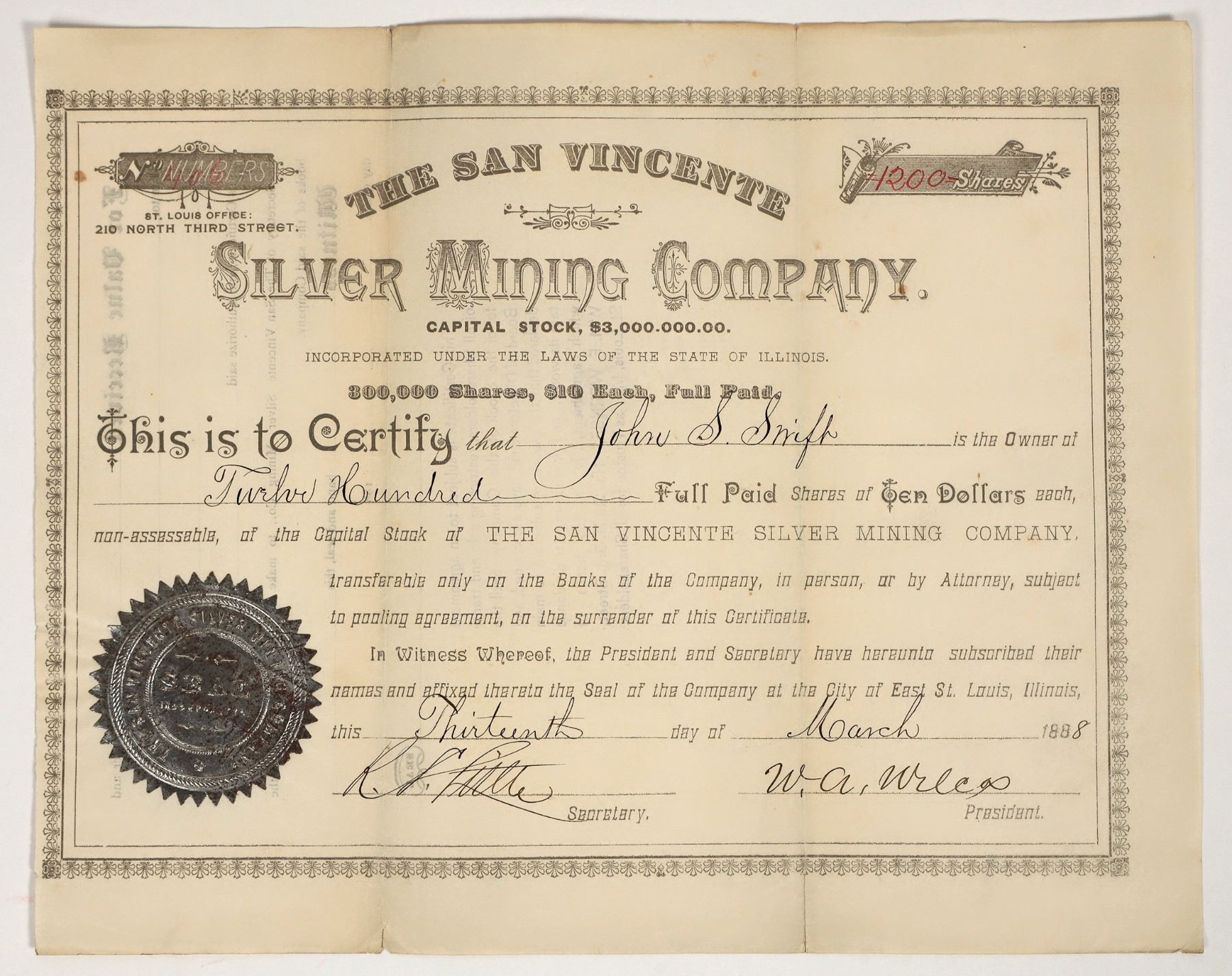 Rare. Inc. in Illinois. No. 406, issued for 1200 shares to John Swift in 1888. Signed by president WA Wilcox and the secretary. Not cancelled. Silver print and seal. Deep folds with some separation. Operated the Maria Agnes and Florence J claims at Silver City, New Mexico. 8.5 x 10.5"