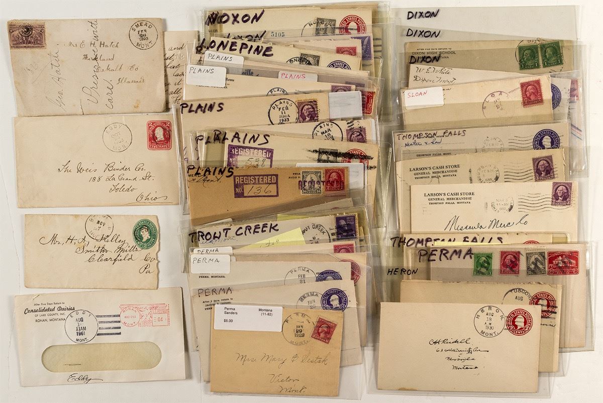 Lot of forty-four. 1) #2 Belknap. 1888 territorial on cover. Four listed in Shellen & Dunn. 2) 1893 Smead (1891-1904). With letter from Sherman and Ella Hatch. Datelined McMinnville. Where is McMinnville? 3) Early 1903 Dixon (1900-1960). Also Sloan, Heron, Thompson Falls, Paradise, Noxon, Niarada, Plains, Lone Pine, Perma, Trout Creek. (Svoboda Collection) City: Sanders County State: Montana Date: 1881-1930's HWAC# 30929