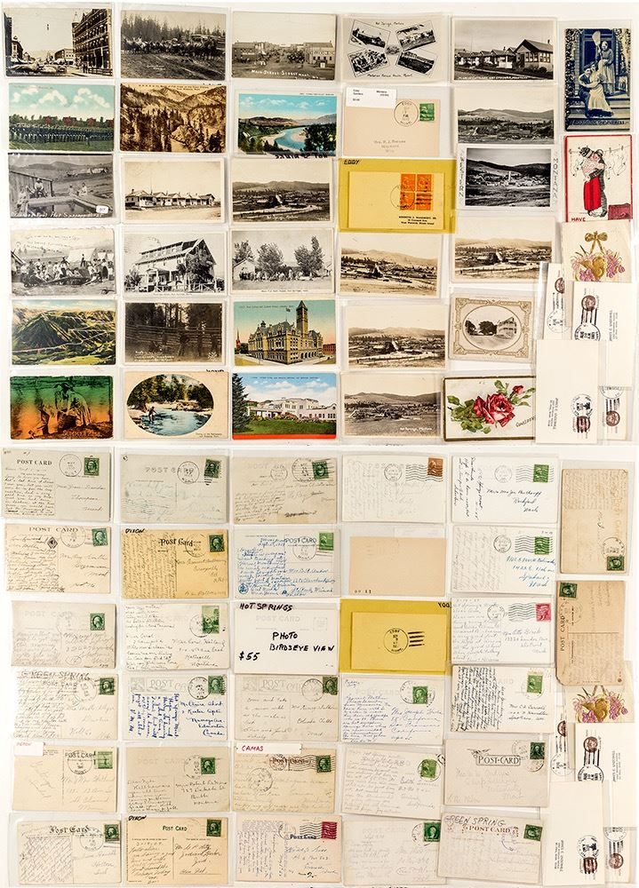 41 postcards in total from nine different towns: Hylent, Camas, Camas Prarie, Eddy, Heron, Hot Springs, Lonepine, Dixon, Green Spring & Beaver. Includes eight postcards from post offices open only a short period; two from Green Spring, open from 1910-1916 (1911 & 1912), and six more from Beaver, which was open from 1907-1914, (1908, 1911, & 1912). This Sanders county lot has a terrific selection of eleven different real photo postcards mostly of birds eye view town scenes. Contains six postal cards, and has at least seven different postmark cancels throughout. (Svoboda Collection)