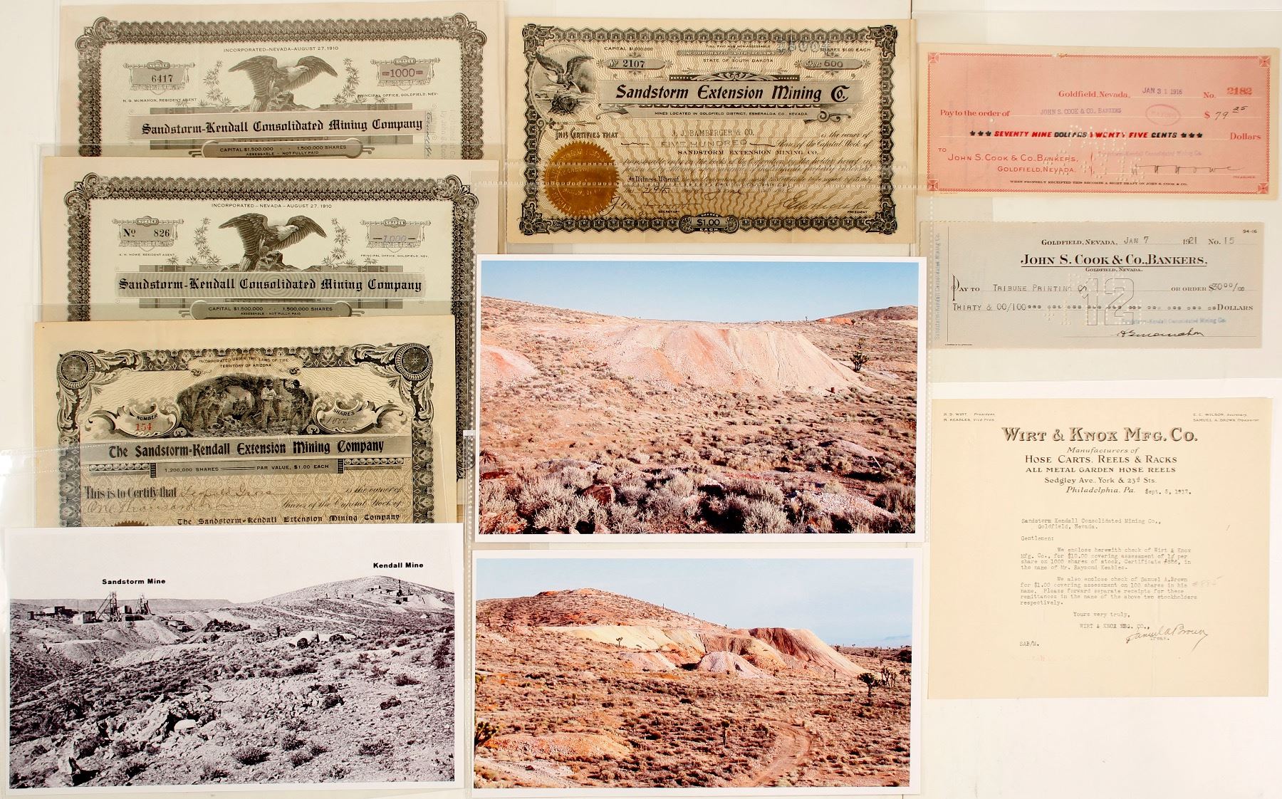 Lot of 11 including stocks, checks, and photographs. 1) Sandstorm-Kendall Consolidated Mining Company. Two issued stock certificates, 1910 and 1923. Neither cancelled. Green background and eagle vignette. Folds. 2) The Sandstorm-Kendall Extension Mining Company. Stock No. 154 issued in 1909 for 1,000 shares. Not cancelled. Very ornate border and underground mining vignette. Folds. 3) Sandstorm Extension Mining Company. Two different stock certificates issued in 1905 and 1908. Neither cancelled. Pinholes, folds. 4) Two different checks for the Sandstorm-Kendall Cons. MC. Issued in 1916 and 1921. 5) 1917 letterhead from Wirt & Know Mfg. Co., Philadelphia, sent to the company about assessments on stock. 6) Three modern photo prints. One shows the Kendall Mine Dump; another shows the Sandstorm Mine Dump; and the last is a reprint of a c.1909 view of both mines. 6 x 11" The Sandstorm claim situated about 2 miles north of Goldfield was staked on December 2, 1902 by Messrs Stimler and Marsh and according to popular tradition was the first mining location in the district. Other claims in the group owned by the Sandstorm Mining Company are the Kruger, Magnolia and Stimler fraction. Efforts to find ore were at first unsuccessful and it was not until December 1904 that JR Davis, JP Loftus and AH Mayne lessees found rich ore and began shipping. [The Geology and Ore Deposits of Goldfield, Nevada" by Ransome et al] It was a producing mine in 1905 and 1906 (Couch & Carpenter). (Bennett Collection) Date: City: Goldfield State: Nevada HWAC# 68067