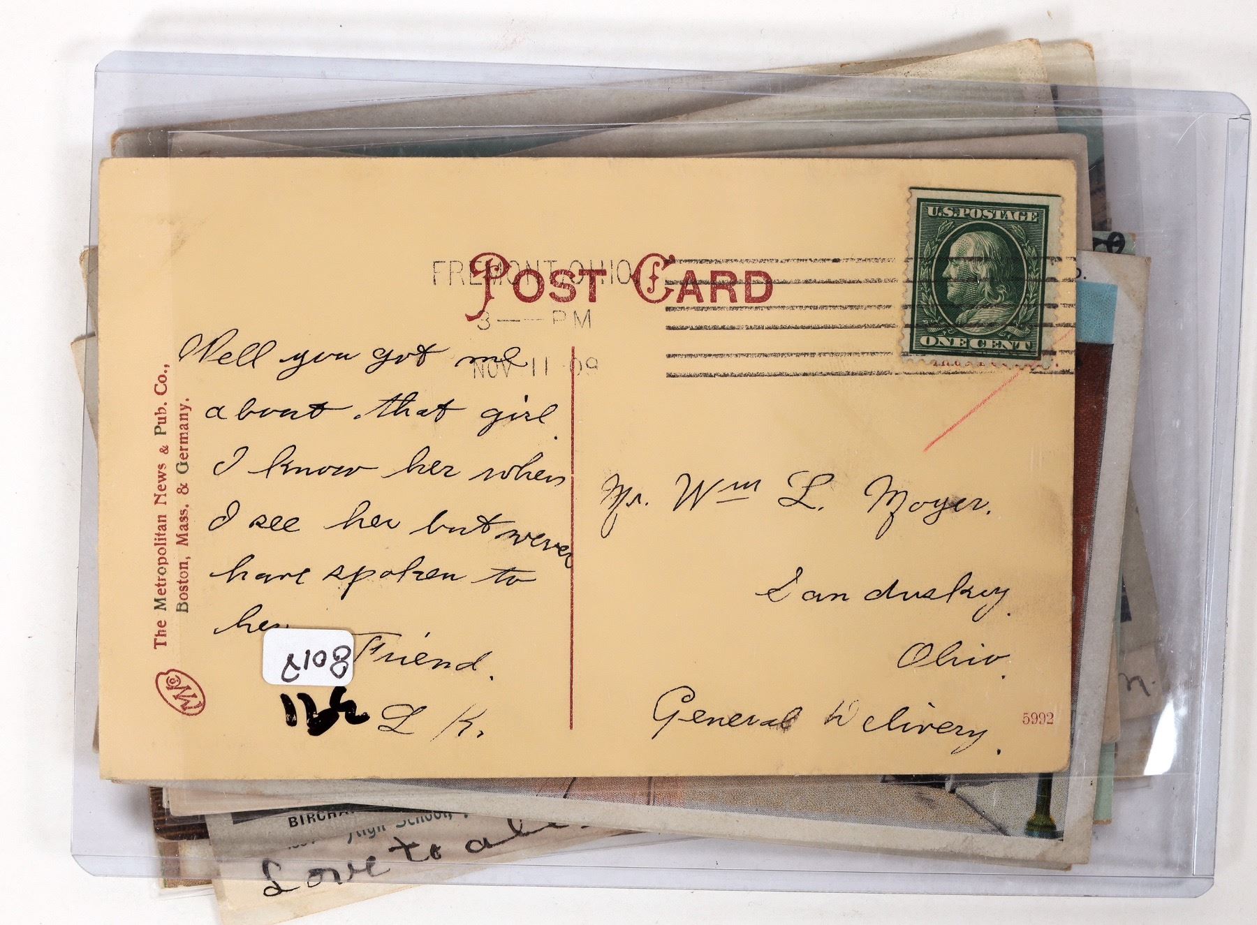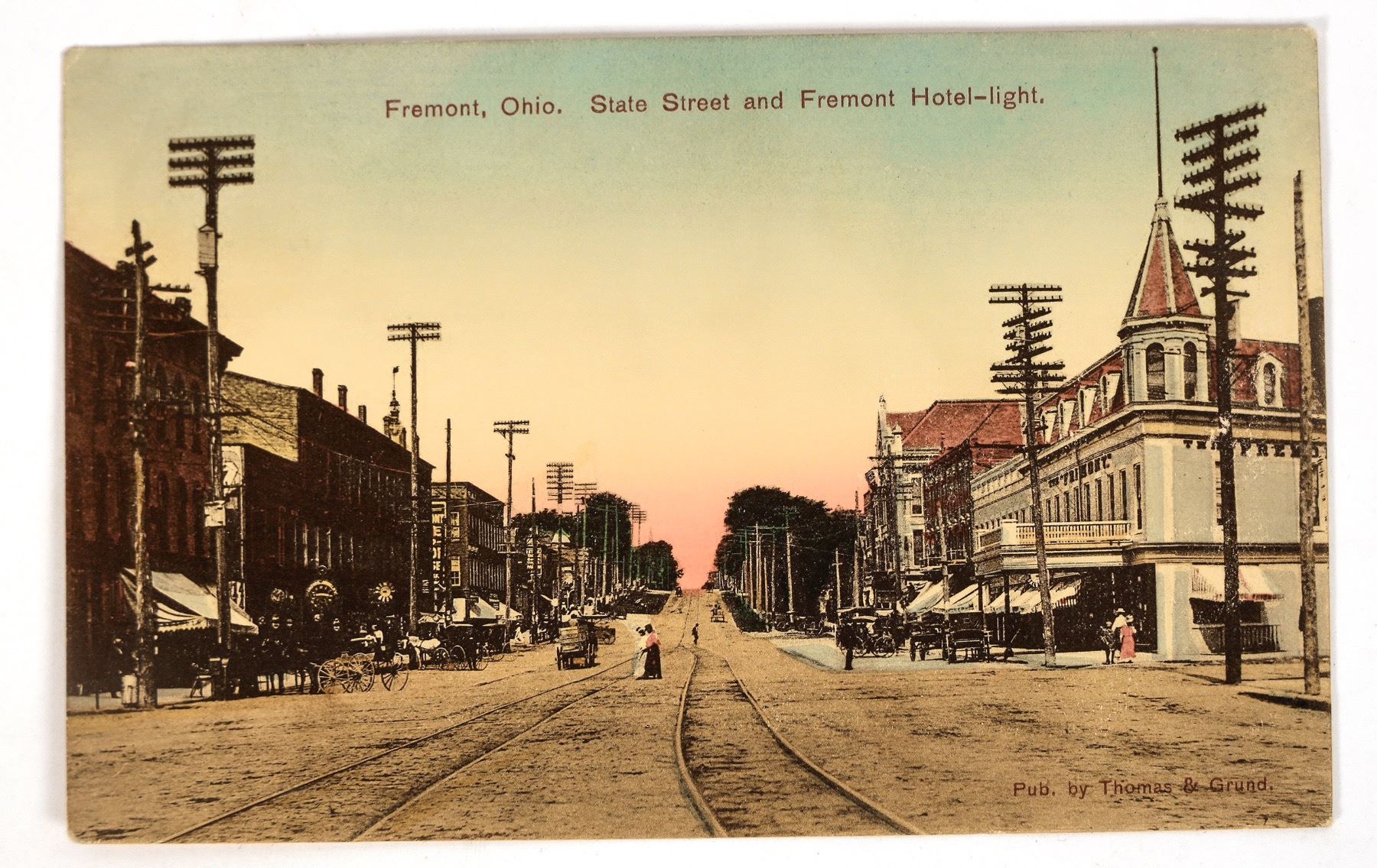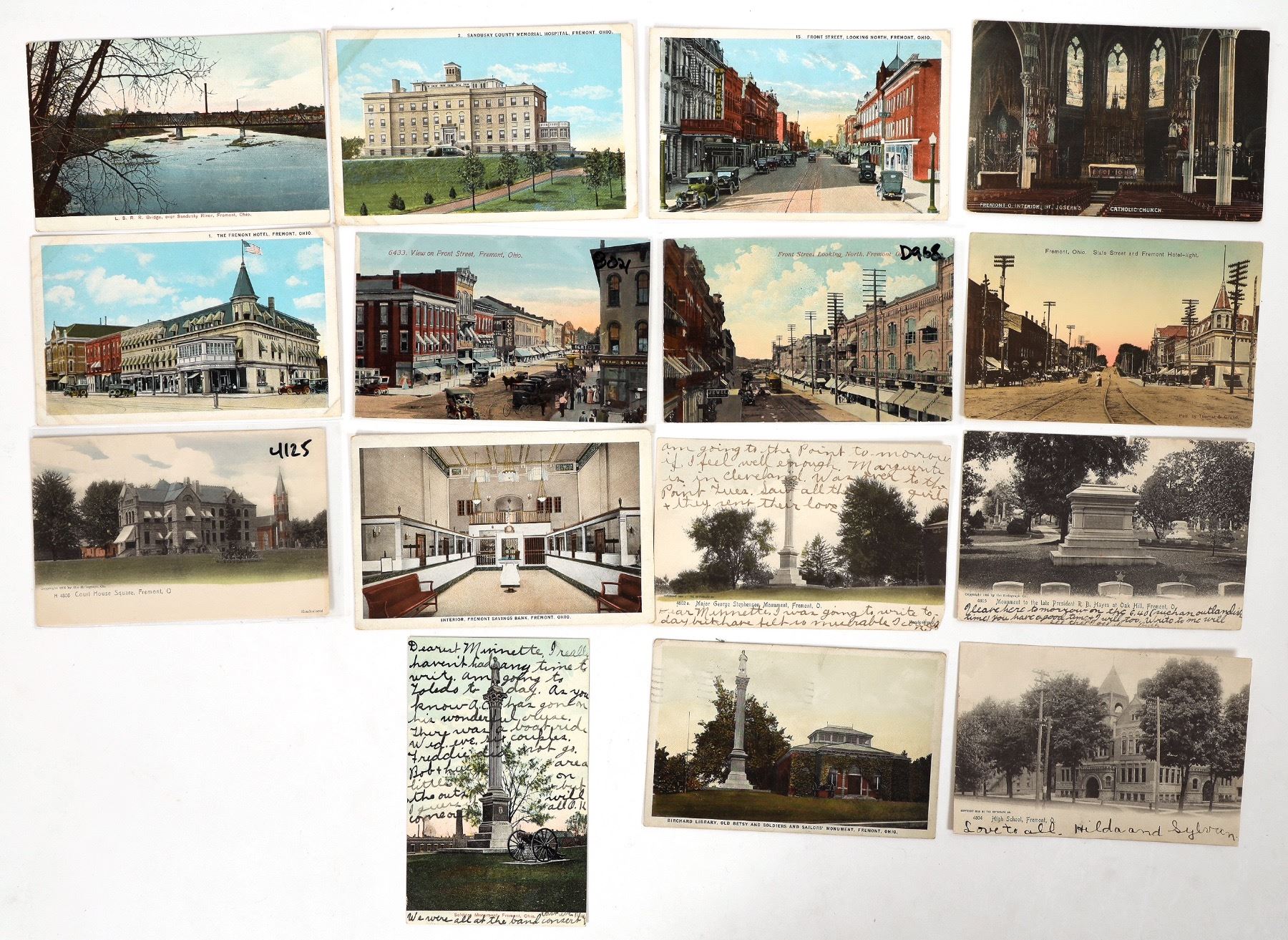 Collection of 15 postcards from Sandusky Co., town of Fremont, Ohio, c1905-27. Includes high school, Birchard Library, Old Betsy and Soldiers and Sailors' Monument, monument to late President R.B. Hayes at Oak Hill, Fremont Savings Bank interior, etc.[ Fremont Ohio