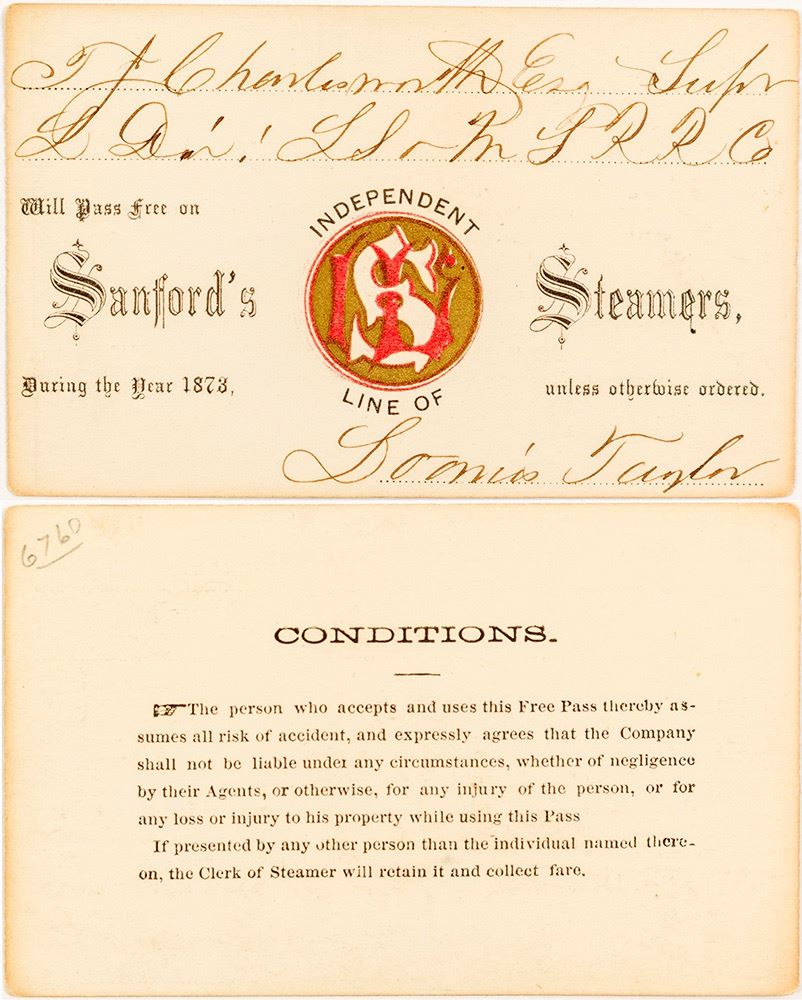 Independent Line! Red, gold and white seal in the middle. Signed by Loomis Taylor. We could find little information on this independent line of steamers other that it ran from Boston to Bangor, Maine. In 1852 Sanford and Taylor made news when they faced charges for illegally transporting liquor. "THE STEAMER BOSTON AFFAIR. In the case of State vs. Capt T.B. Sanford, Loomis Taylor (Agent) and Mr. McMally (sic) for conspiracy to resist Officer Staples in an attempt to seize liquors from the Steamer Boston, at Frankfort, tried before the District Court lately held in Belfast, Capt. Sanford was acquitted, and Taylor and McNally convicted. They gave bail and appealed to the Supreme Court." During the Civil War Sanford and Taylor provided services transporting troops and munitions to Boston free of charge. Date: Location: Massachusetts HWAC # 53557