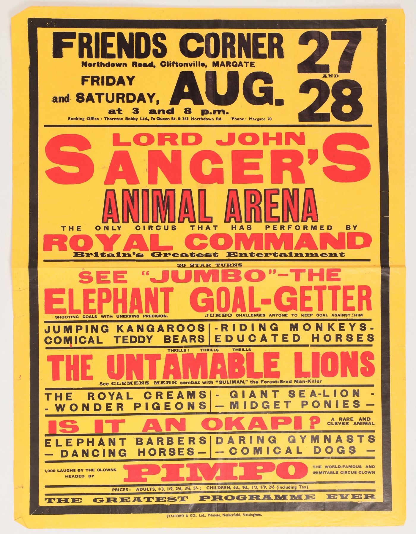 Lord John Sanger's Animal Arena broadside. Untamable Lions. Probably England. 20x15". Corner dog ears.