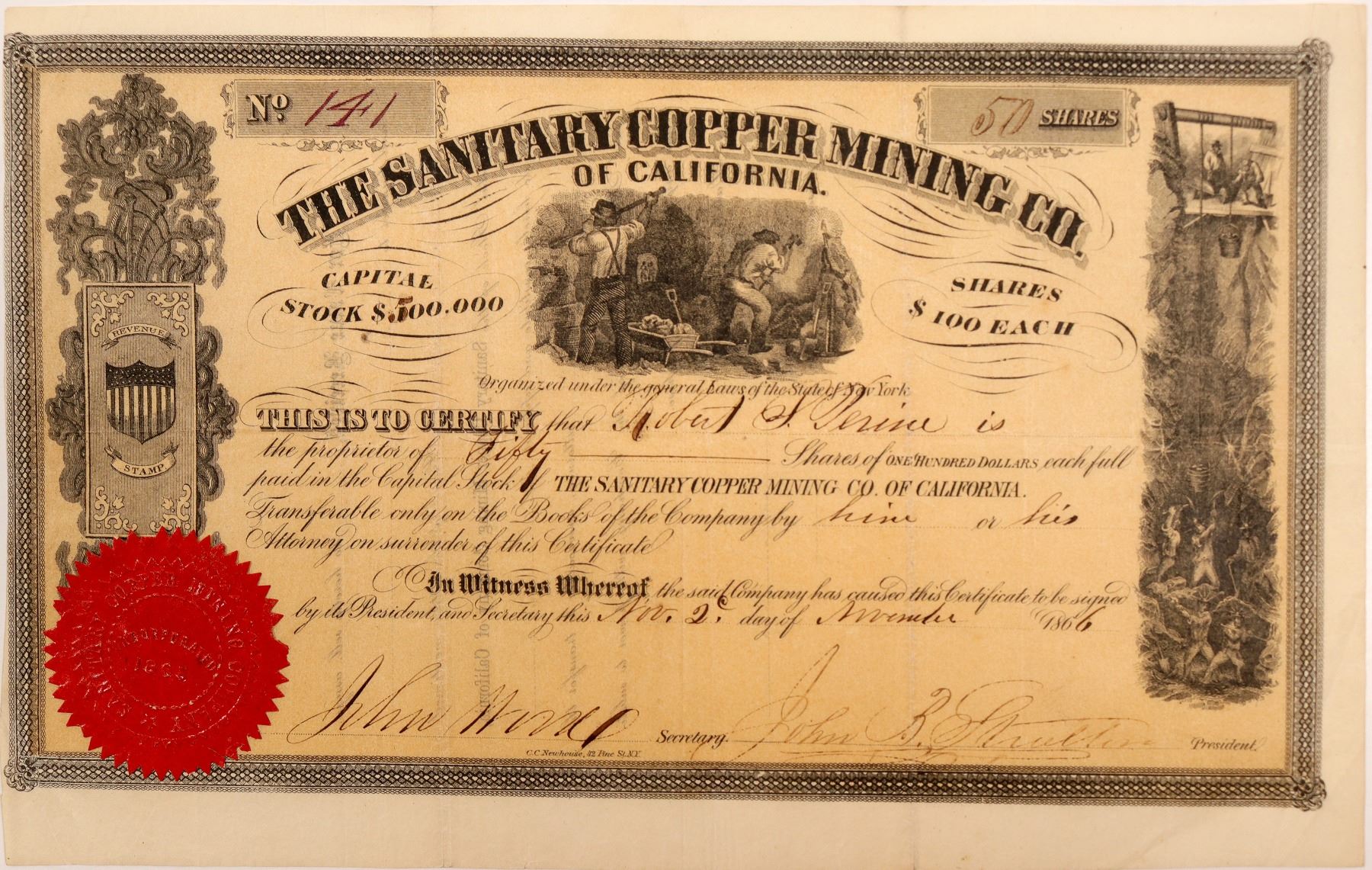 #141 for 50 shares to Robert Devine. Signed by John Wood(?) and president John (?). Dateline November 2, 1866. Incorporated 1865 in New York. Not cancelled. Two mining vignettes. CC Newhouse of New York printer. Red seal attached. Trimmed unevenly at left. Two vertical folds. Dog ears. "It is lear in my mind (says the author] that one million of dollars judiciously spent in the country would give millions in return in one year." [Daily Alta California, June 23, 1864] Mine was located somewhere near Crescent City in Del Norte County in northern California. State: California City: Crescent City Date: 1866