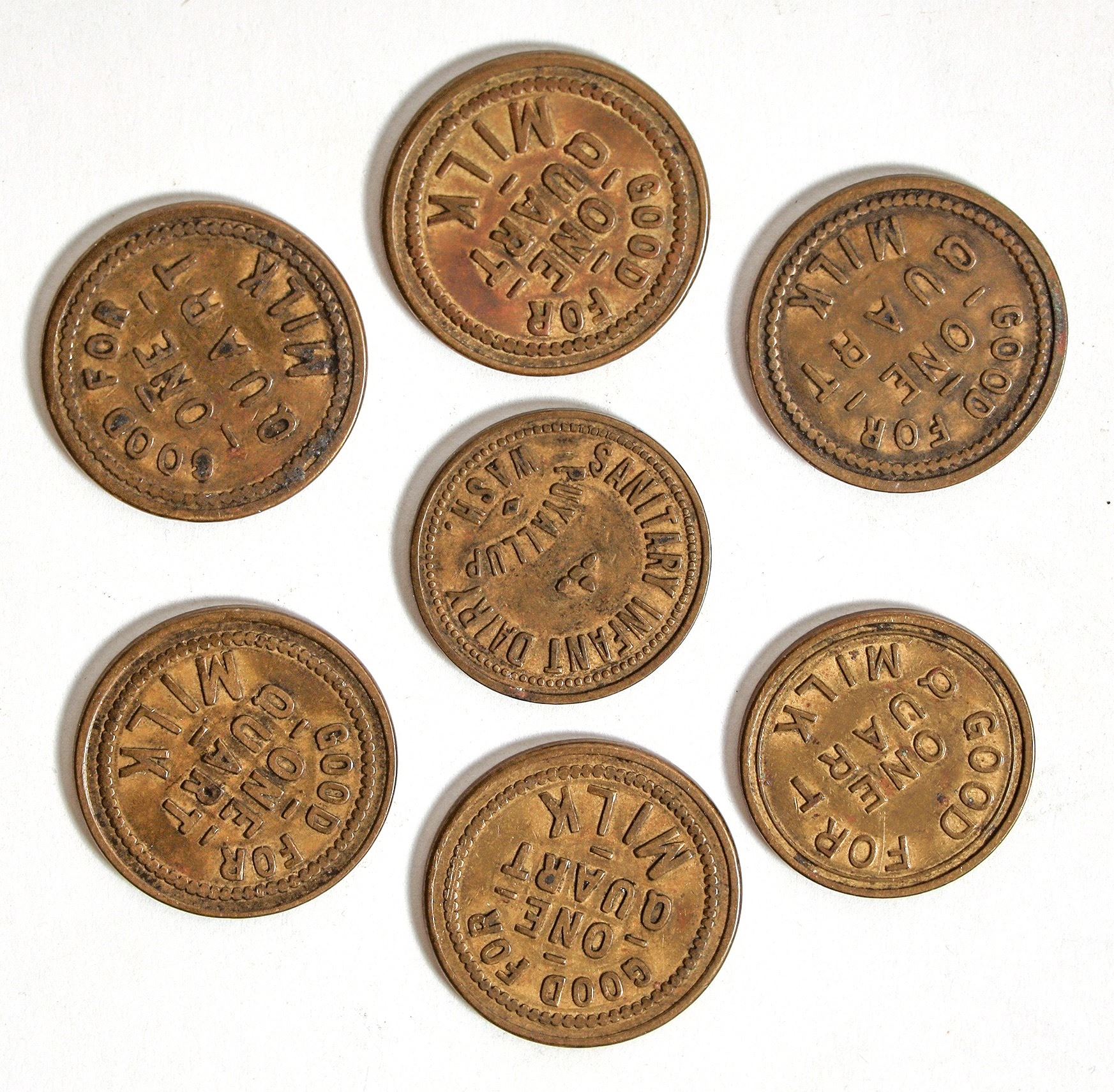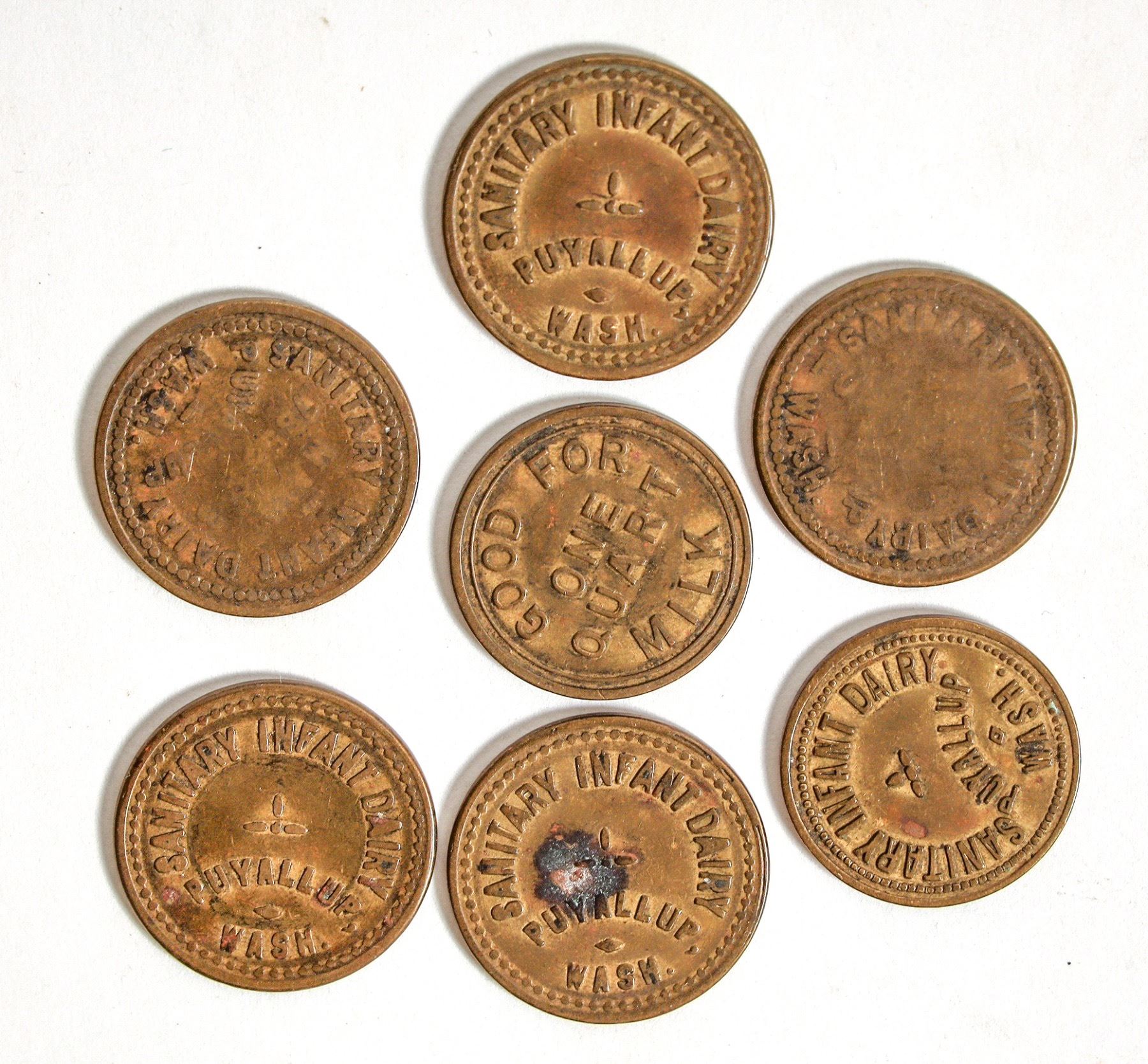 Seven tokens, two sizes: 1) (2) SANITARY INFANT DAIRY / PUYALLUP / WASH. // GOOD FOR / ONE / QUART / MILK; Br., rd., 22 mm. 2) (5) SANITARY INFANT DAIRY / PUYALLUP / WASH. // GOOD FOR / ONE / QUART / MILK; Br. rd., 24 mm.[ Puyallup Washington
