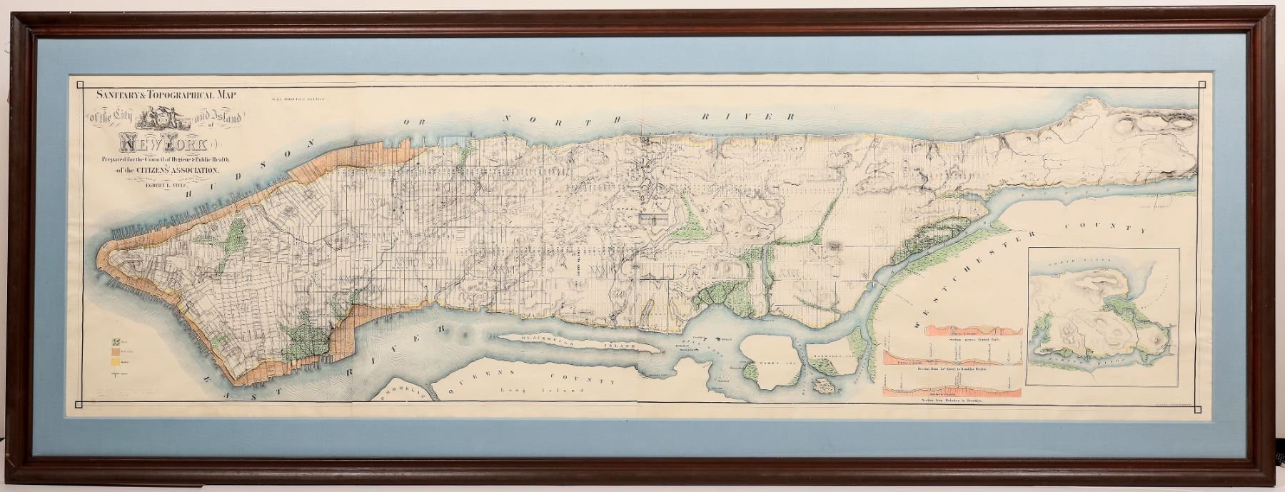 Manhattan Island map surveyed by Mexican American & Civil War veteran Egbert Viele 1865. Viele was author of a color city map, a "Sanitary & Topographical Map of the City and Island of New York," first published in 1865, and now called the "Viele Map", which shows his survey of the original streams, marshes and coastline of New York City, superimposed over the street grid. The map is still used by modern geotechnical engineers, structural engineers and planners to design the foundations of new buildings and structures in the city. The framed and matted map measures 70"x 26" and is in excellent condition, ready to hang. Please see photos for more details. New York