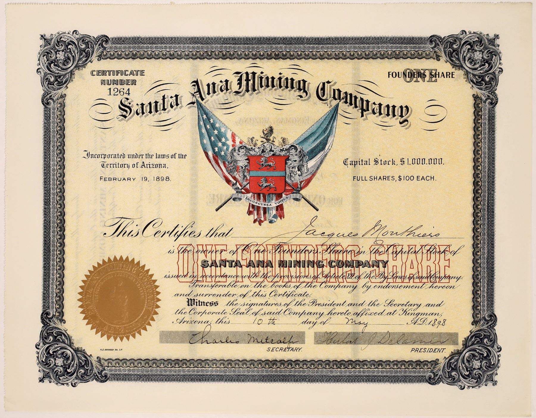 Certificate # 1264 for one Founder’s share on May 10th, 1898 to Jacques Mouthiers. Approximately 13 x 10 inches. Gorgeous multi-colored, extremely rare certificate variety has been eagerly sought by collectors for many years. It is one of the major pre-statehood certificates from Arizona and most appealing visually; of unusually large size, it carries red, white and blue artwork of a draped American flag fronted by a similarly colored heraldic shield with rampant lions and with Latin motto. A large gold seal carries a finely embossed likeness of a woman holding an infant, with an older child by her side. 9 x 12". Excellent Condition. It would look good in any collection!
