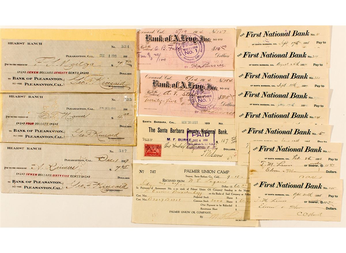 Lot of 15. Includes: three 1919 checks from Hearst Ranch, Pleasanton; eight drafts from the First National Bank of Santa Barbara, 1897-98; 1899 draft from the Santa Barbara County National Bank w/ adhesive revenue; 1916 assessment receipt for the Palmer Union Oil Company, Sisquoc; and two 1914 drafts from the Bank of A. Levy, Inc. Oxnard. (Prag Collection)