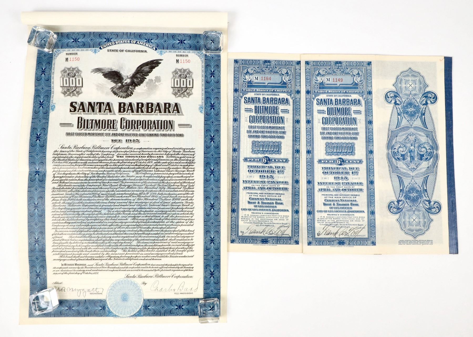 Lot of 3. I/U. Issued 1928. EF cond. Santa Barbara Biltmore Corp., $1000, 6 1/2% gold bearer bonds with coupons. Jefferies BNC printer.