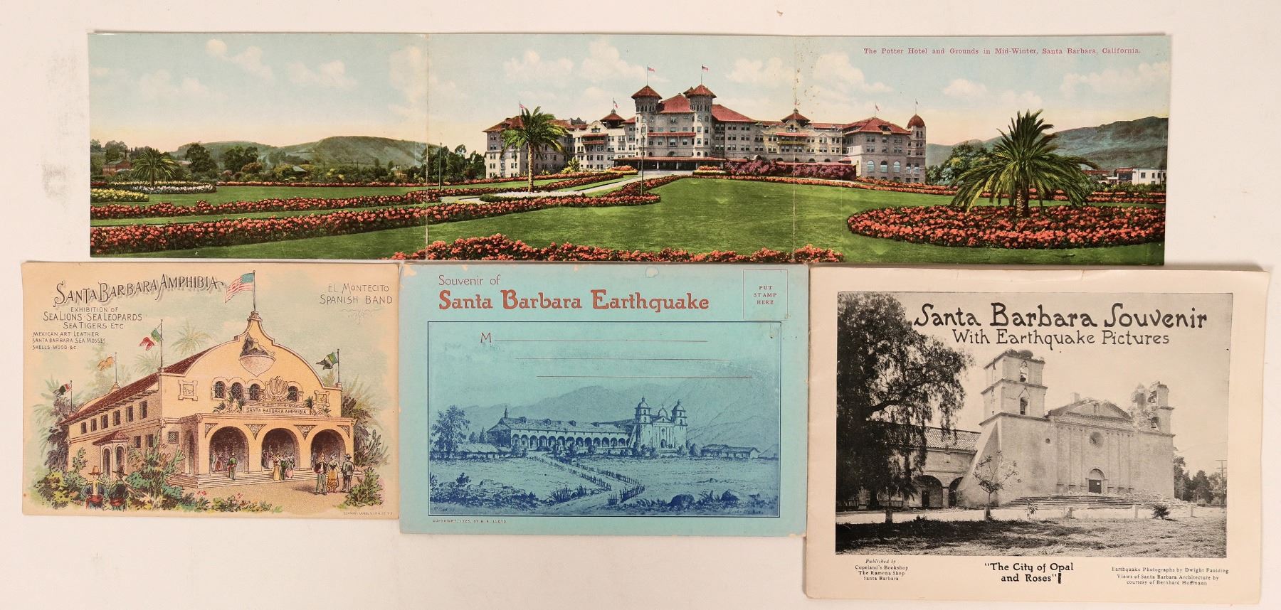 Set includes four souvenirs from Santa Barbara, Calif., from the late 1800's-early 1900's. Includes a tri-fold postcard, blank, of the Potter Hotel which was built in 1903, changed names in 1919 and burned to the ground in 1921. The hotel had 600 rooms, ballroom, billiard rooms, a bowling alley, rose garden and a zoo, among other amenities. Also included are a blank litho postcard of Santa Barbara Amphibia, c1894; and two souvenir booklets with pictures from the 1925 earthquake. See photo for details.