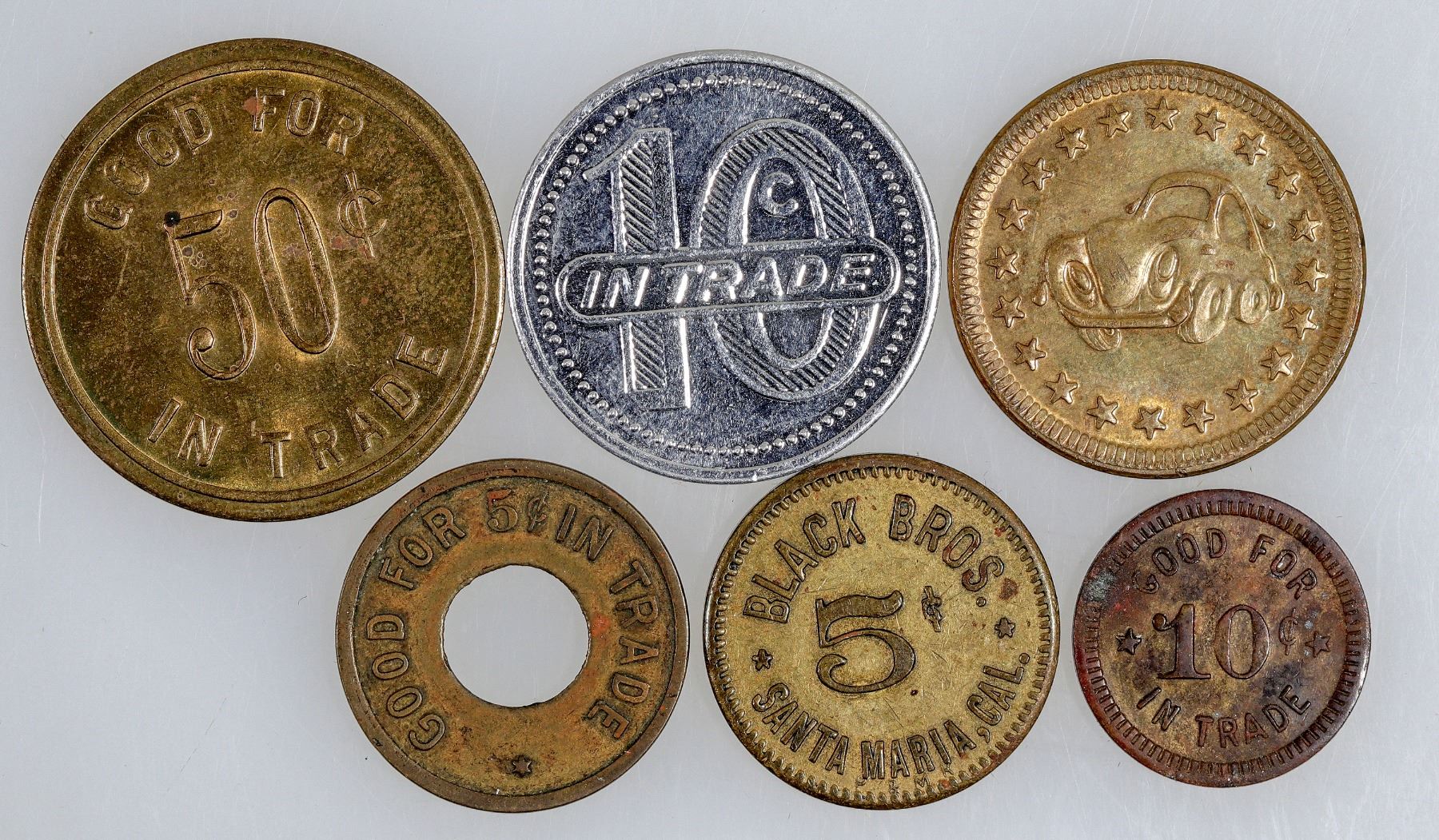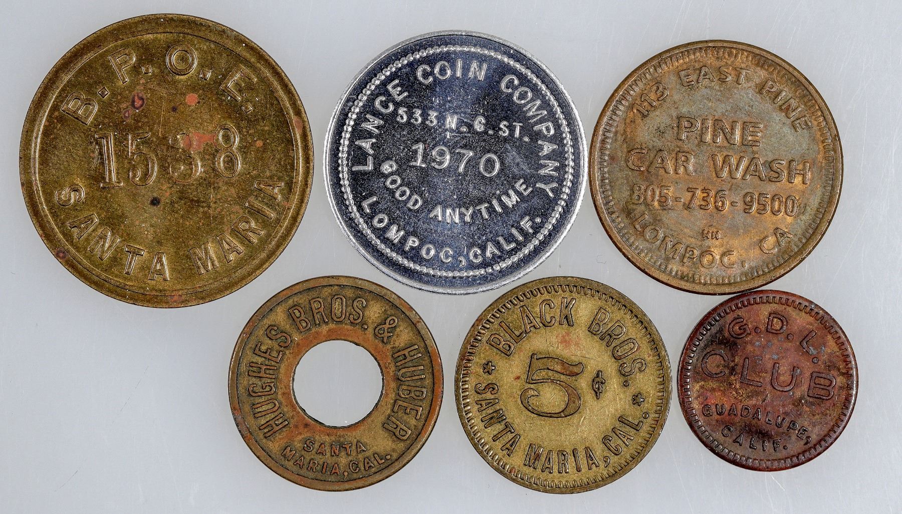 Lot of six tokens from Santa Barbara County: Lompoc (2): Lance Coin Company; Pine Car Wash. Guadalupe: G. D. L. Club. Santa Maria (3): Black Bros., B. P. O. E. 1538, Hughes Bros. & Huber. California