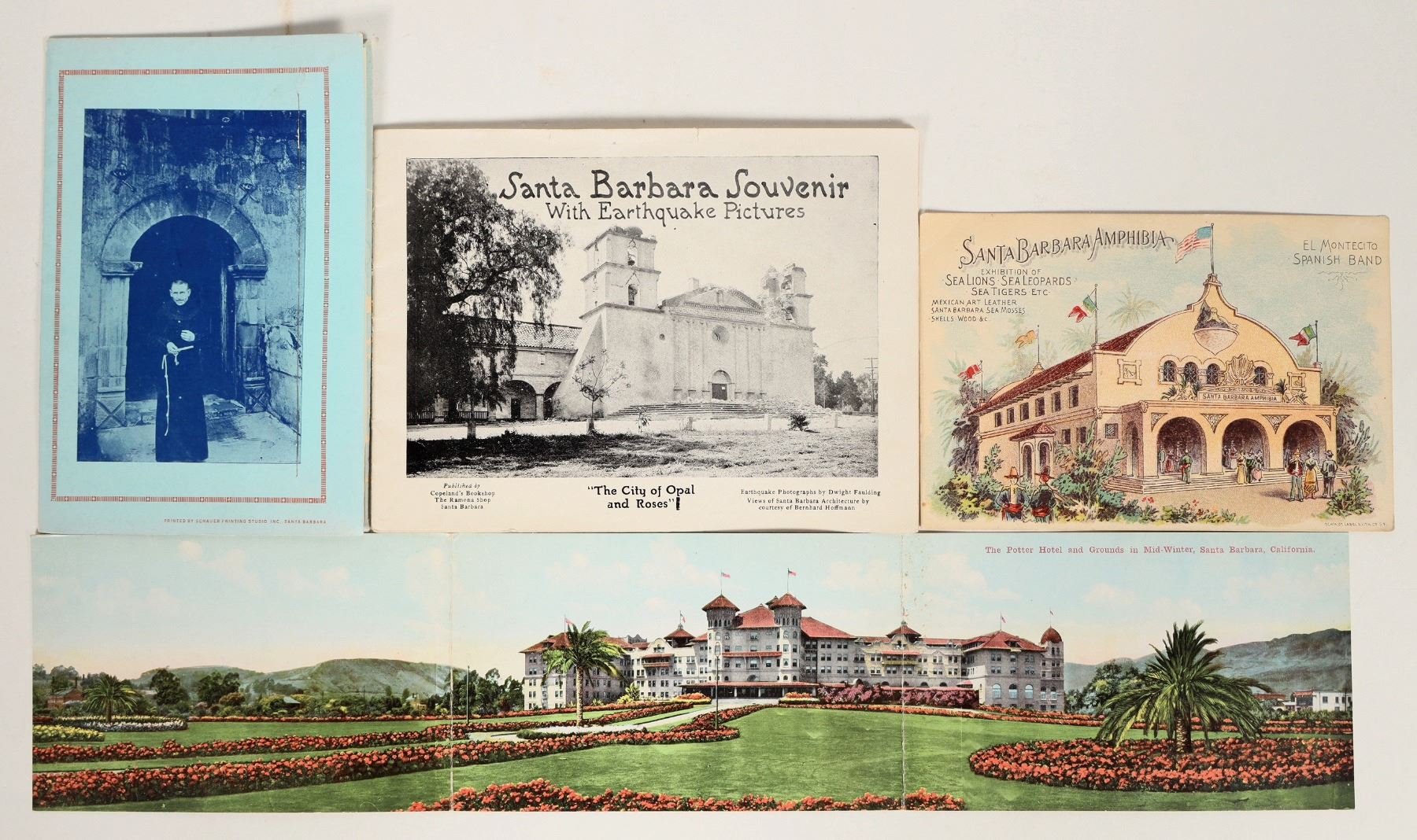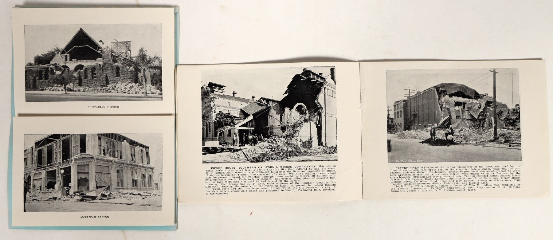 Lot of 4. 1) Santa Barbara Souvenir with Earthquake Pictures. Published by Copeland's Bookshop and The Ramona Shop. 9 pages with photos and description of damage from 1925 earthquake. 5 x 7" 2) Souvenir of Santa Barbara Earthquake. Mailer with accordion 6 panels, double-sided, with photos of earthquake damage. Published by Schauer Printing Studio, Santa Barbara, c.1925. 3) Three fold panorama printed color postcard of The Potter Hotel. Not mailed. 4) Postcard sized tradecard for the Santa Barbara Amphibia, Exhibition of Sea Lions, Sea Leopards, Sea Tigers, etc.
