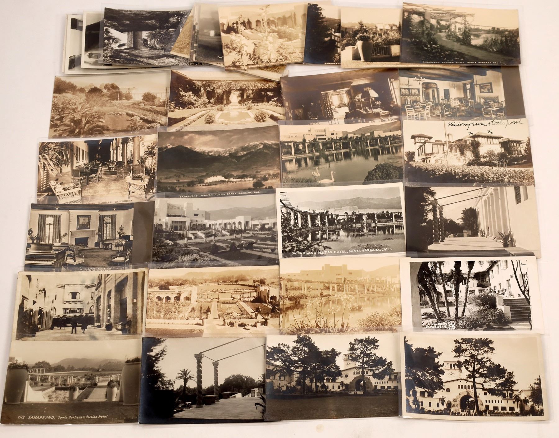 Lot of 32. A few white borders. Six postmarked 1910-30: L.A., mSanta Barbara, Nassau Bahamas. Samarkand Hotel-few of the original structure and now a church/senior living(several street, distant and birds-eye, interior). El Mirasol now Alice Keck Park (interior, exterior), Miramar-meaning behold the Seia. Originally started 1889, abandoned and bought in 2016, now renovated as the Caruso. State:California City:Santa Barbara Date: Provenance: Ken Prag Collection