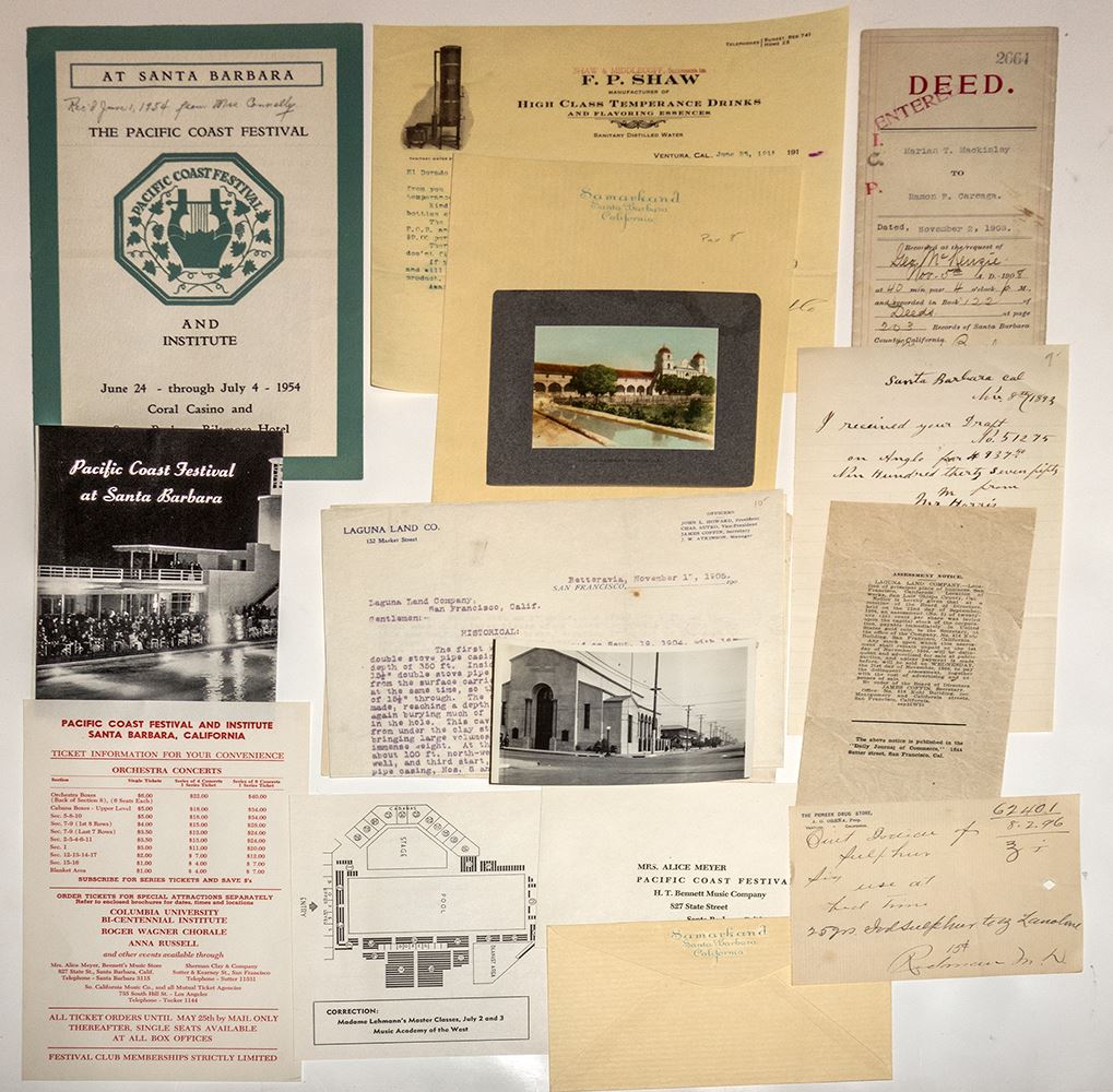Eleven pieces of history: 1903 deed from Santa Barbara; 1954 program for the Pacific Coast Festival; papers from the Laguna Land Co.; receipt from F.P. Shaw of Ventura, 1915 to El Dorado Brewing Company; receipt Pioneer Drug Store, Ventura; photo Santa Barbara mission; 1922 photo Santa Barbara bank building.