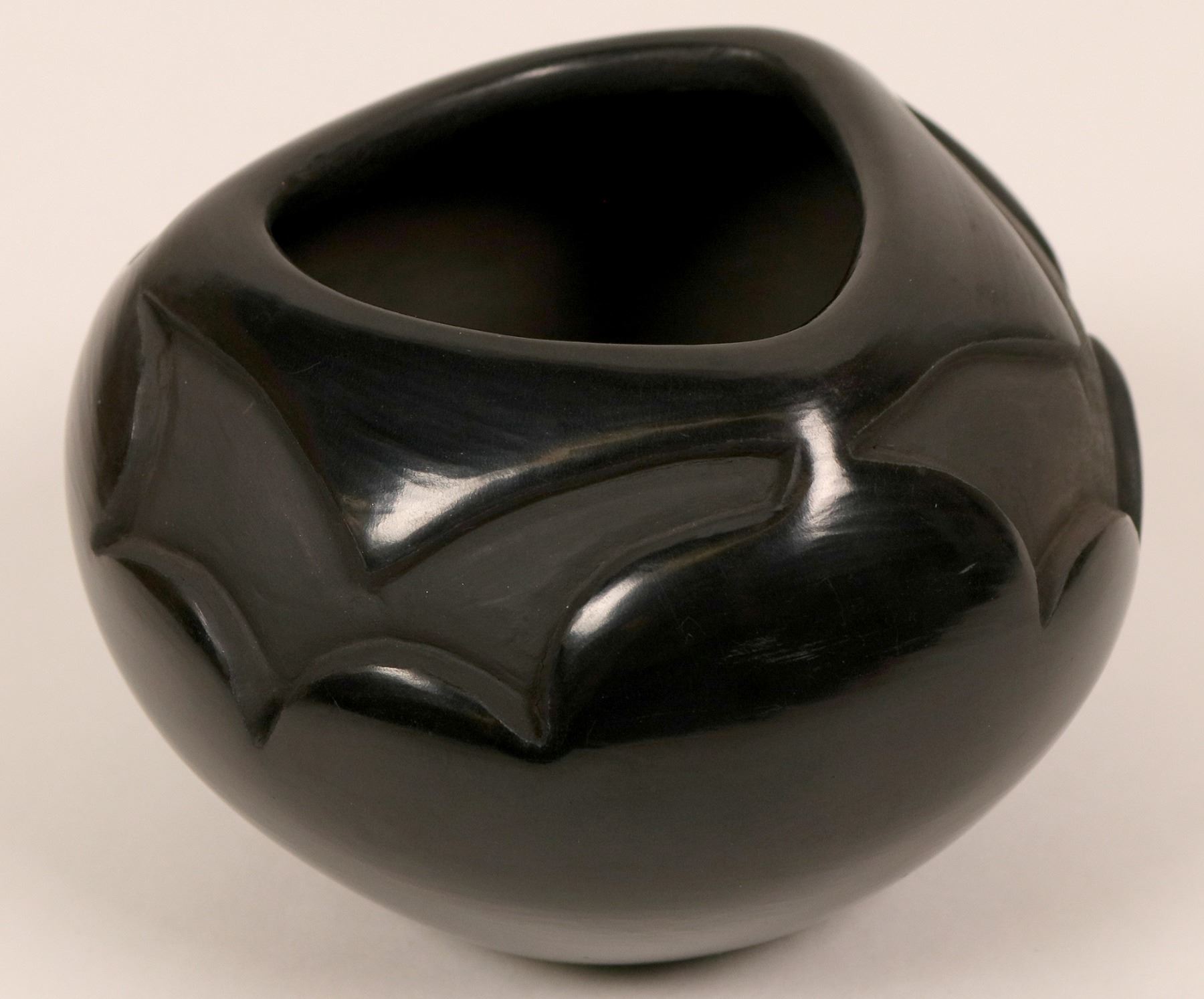 Santa Clara Blackware Pottery piece signed Tricia Valarde Santa Clara Pueblo the pot has a triangular opening at the top and measures about three inches at the opening and stands about 3-1/2’ tall, the pattern appears to be a butterfly.
