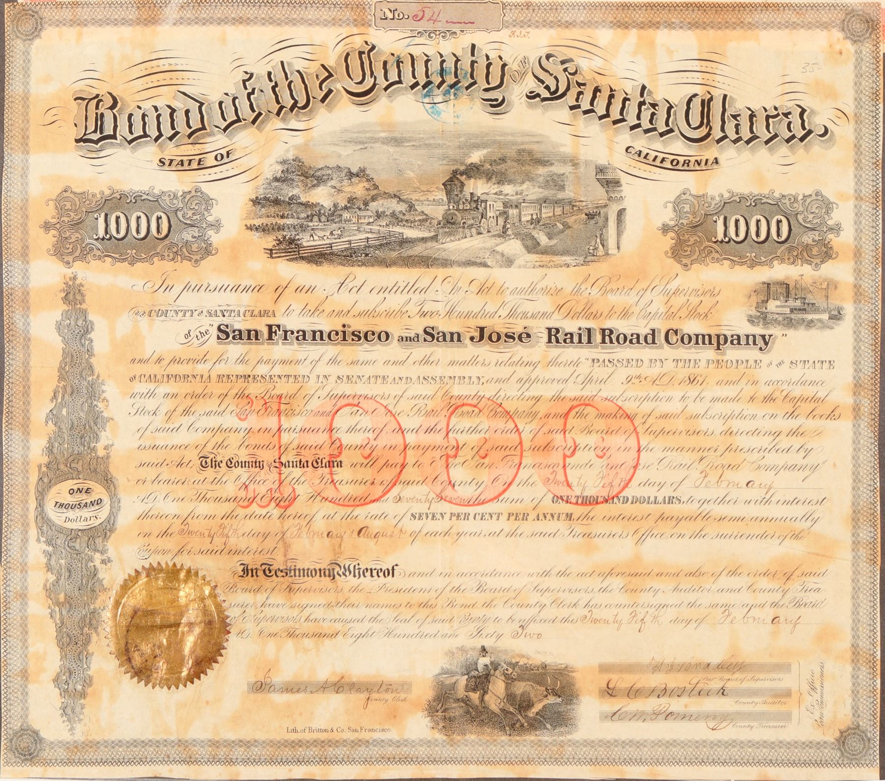 Santa Clara County in aid of San Francisco & San Jose Railroad, I/U, #54 $500 7 %, 15 year bearer bond due 1877, issued Feb 25, 1862 signed W. J. Bradley Pres. County Board of Supervisors. BLACK, embossed seal, vignette top 4-4-0 passing farm/passengers wait. Vignette right center steamship, Vignette bottom cowboy on horse chasing steer. "1000" red underprint, no coupons, Britton & Co printers. Not listed in Cox or other references. No tears, holes but does have some discoloration. Possibly only known one. Ken Prag Collection