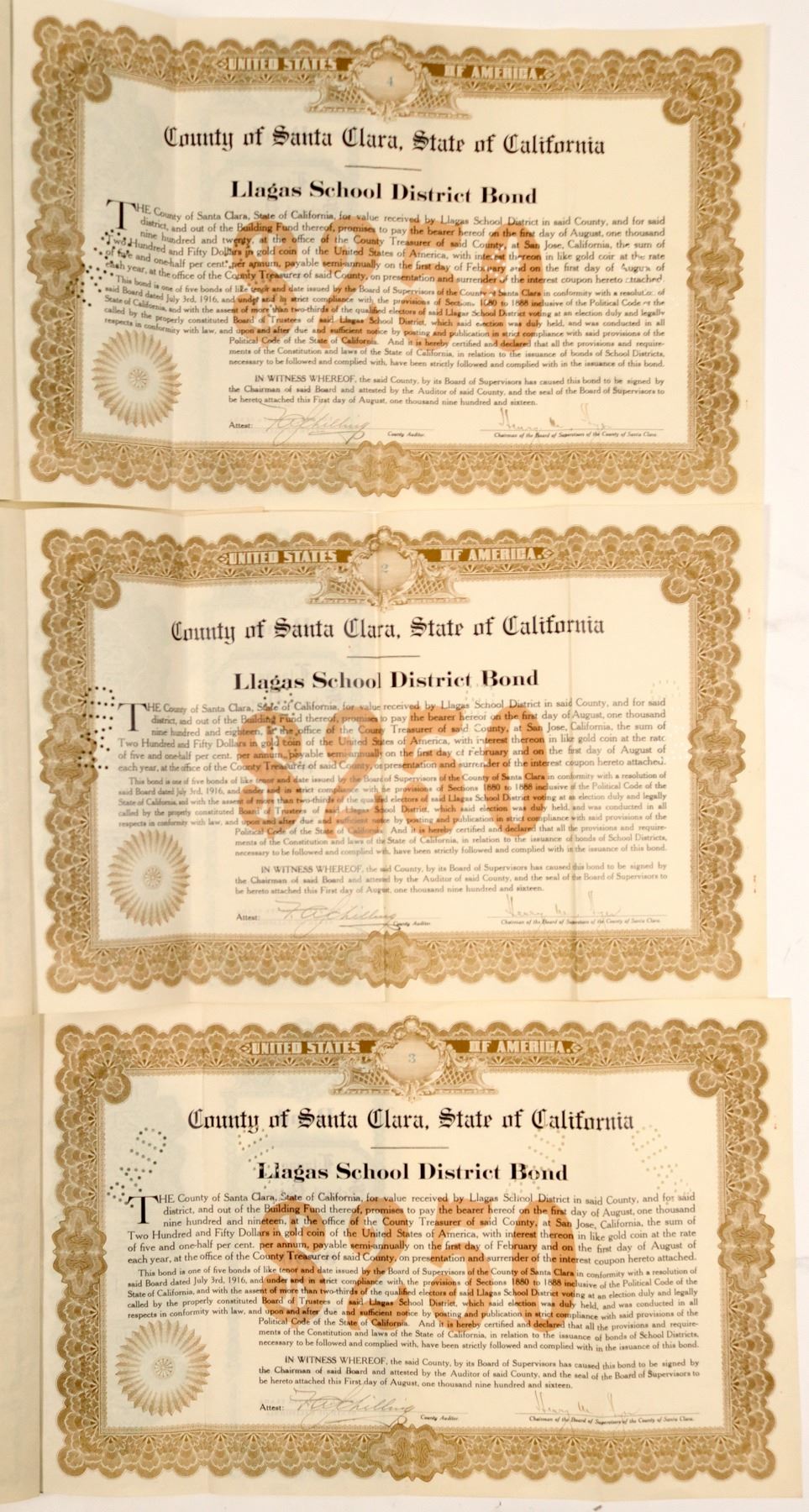 Three bonds from the Llagas School District issued by the Board of Supervisors of the County of Santa Clara.